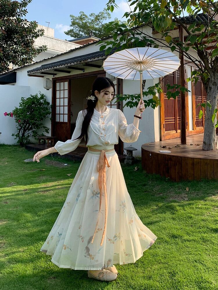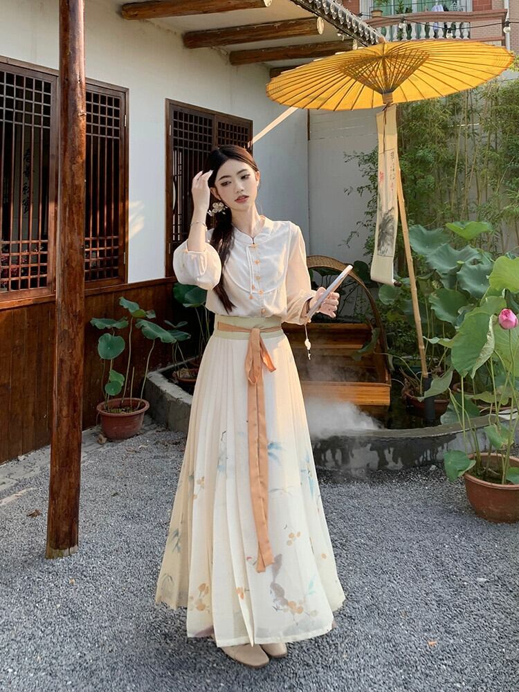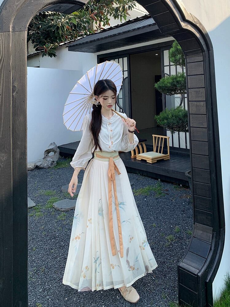 中国風の国民風の長袖シャツ花柄プリーツ馬の顔スカートロングスカート女性秋 2023 新しいファッションツーピースセット オータム 秋物 missk49631608985