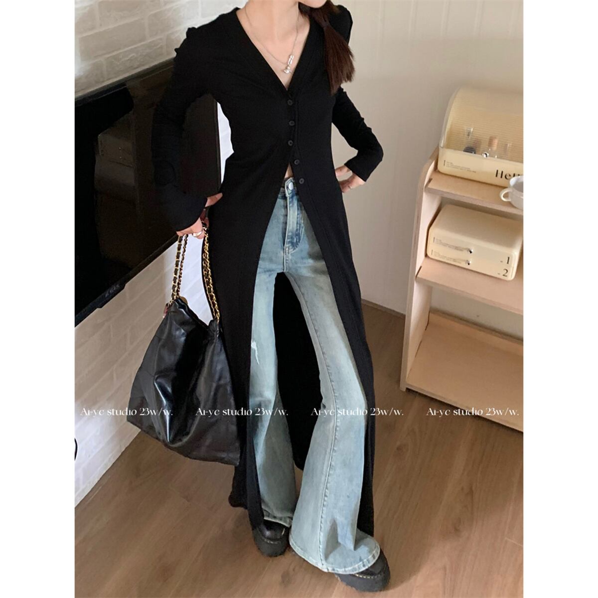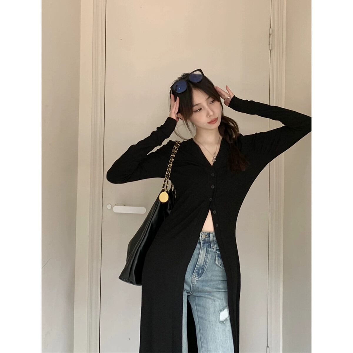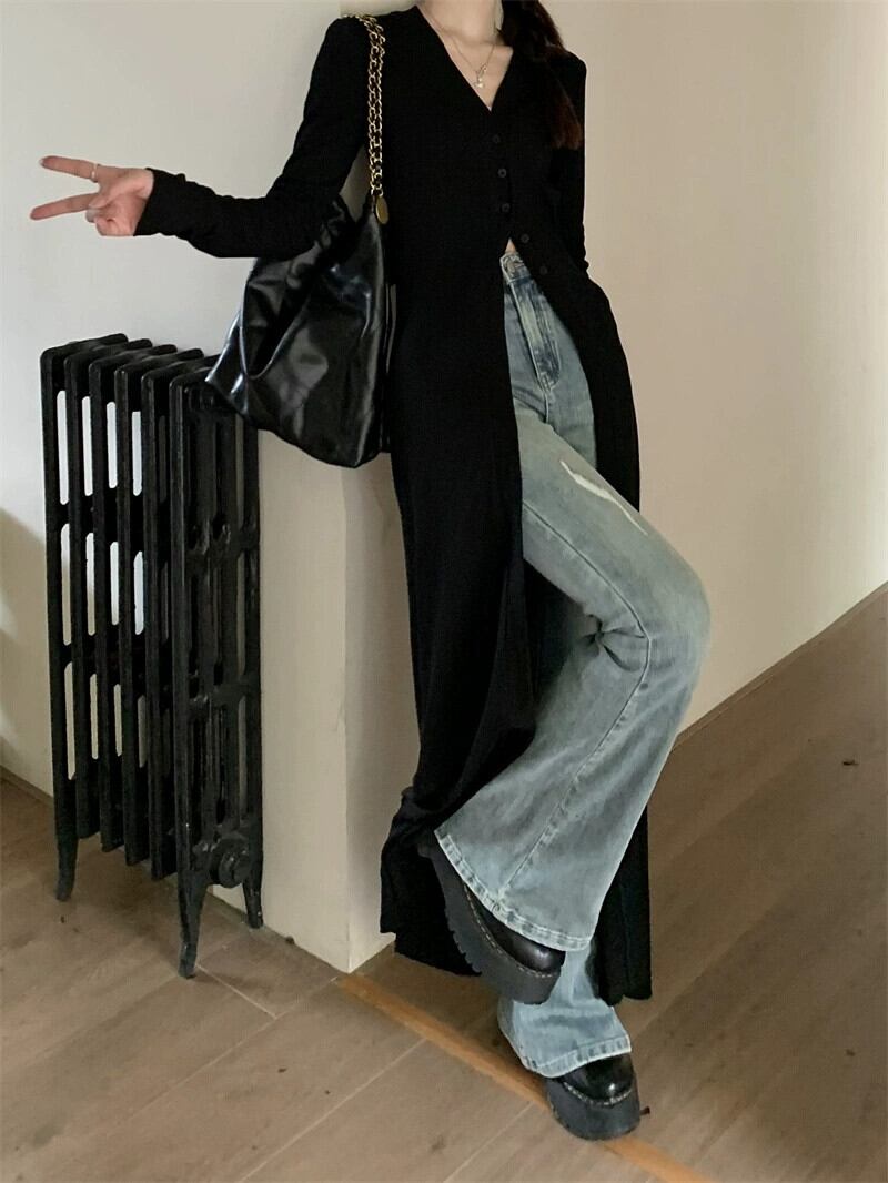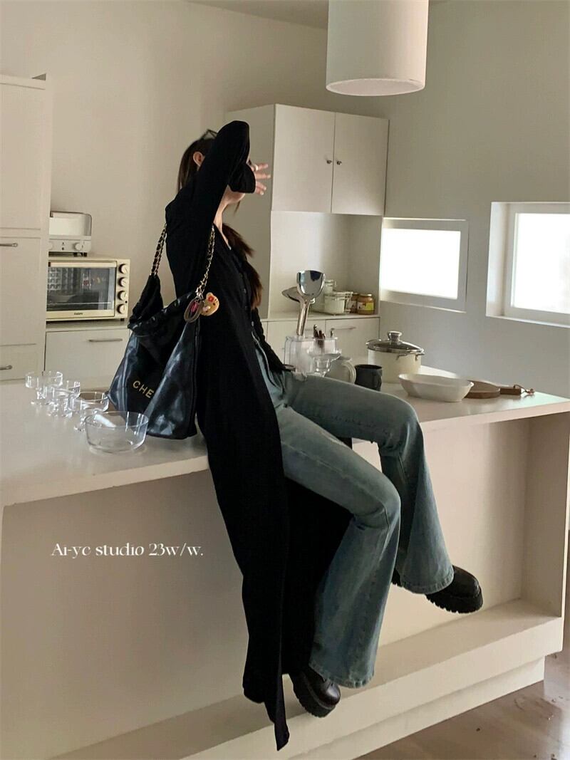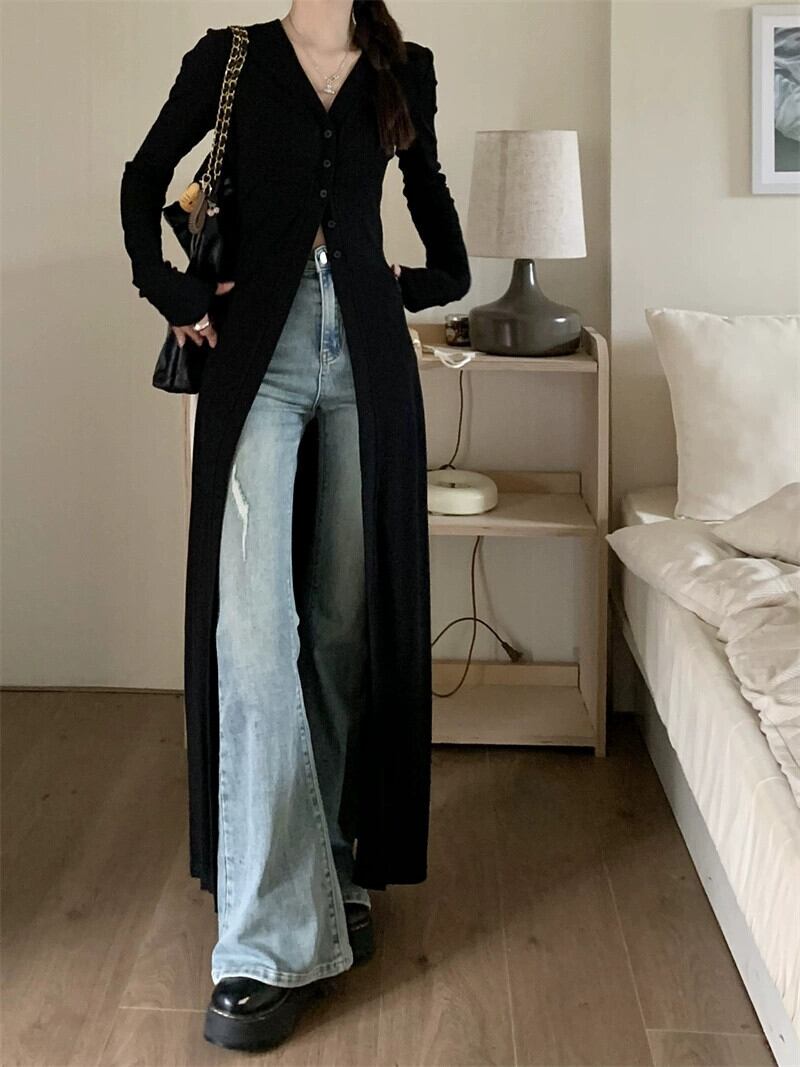 ロングセータージャケットレディース2023年秋新作アメリカンデザインVネックルーズニーハイ長袖カーディガン オータム 秋物 missk55335920079