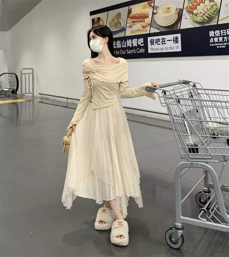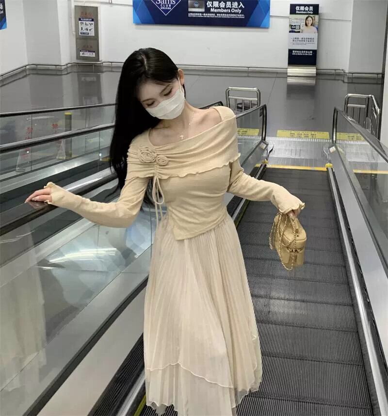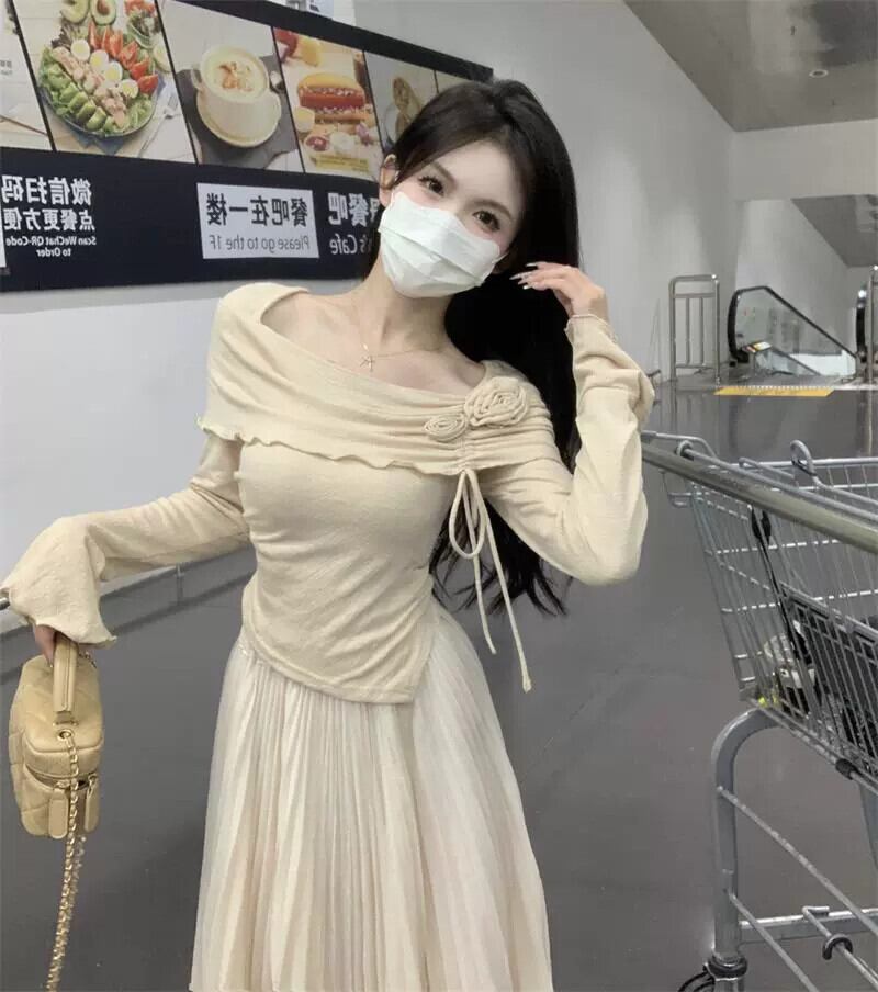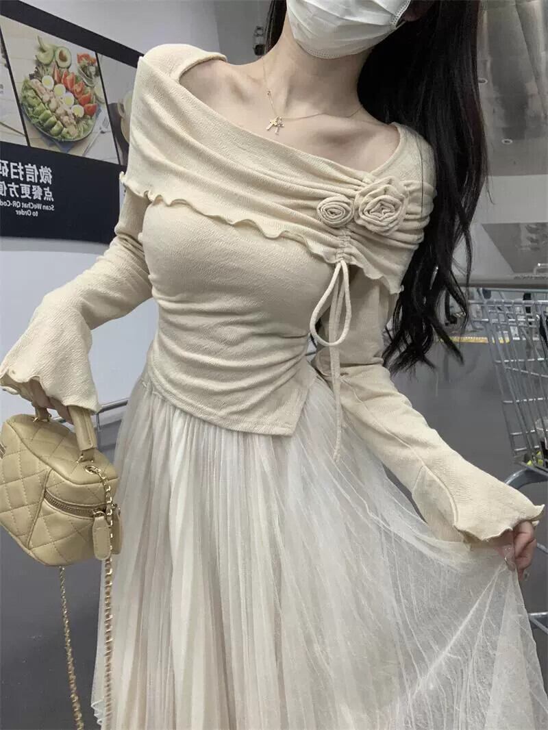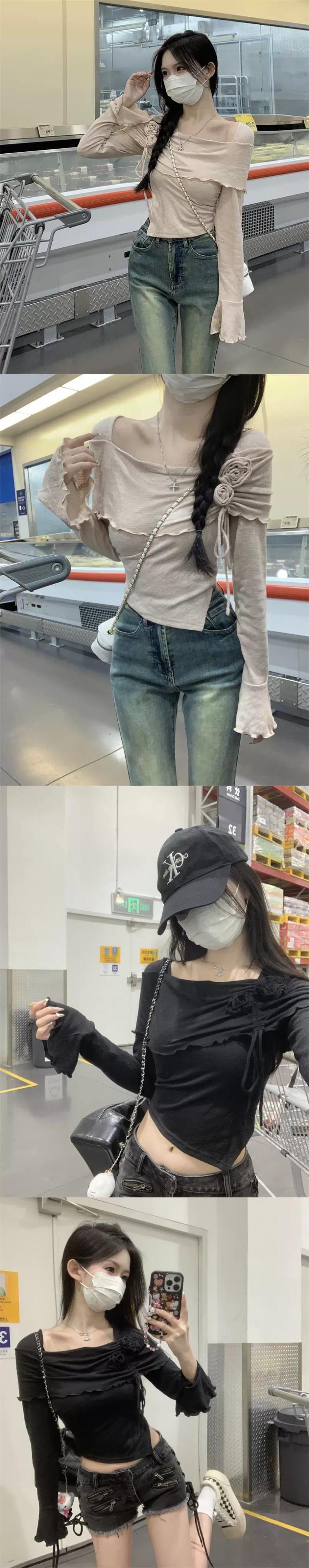 ベルスリーブオフショルダー長袖 Tシャツ女性 2023 秋の新しい甘いデザインスリムでシックなトップ ロング 大人ガーリー スウィート キュート カジュアル オータム 秋物 missk95362505378