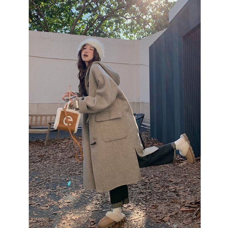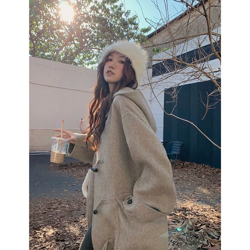 大きなポケットフード付きホーンボタンウールコート冬 2023 新しい緩いファッショナブルなミドル丈ウールコートの女性 ウィンター 冬物 missk78252366916
