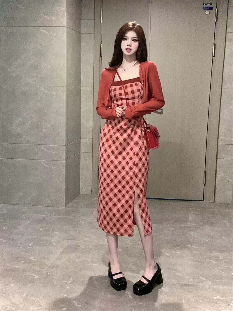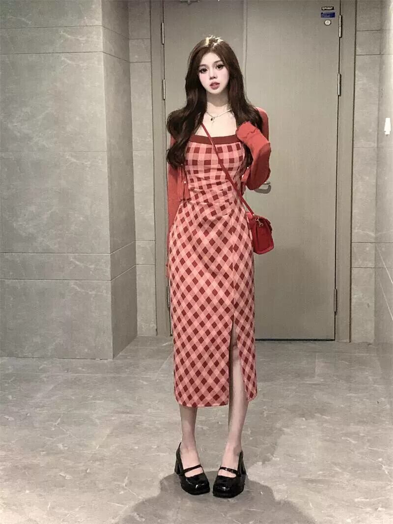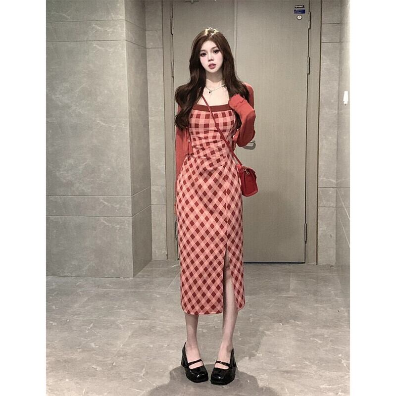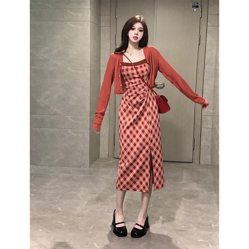 チェック柄サスペンダードレス女性秋 2023 新しいウエスト痩身ミッドレングスフレンチレディスタイルスリットスカート オータム 秋物 missk98458328303