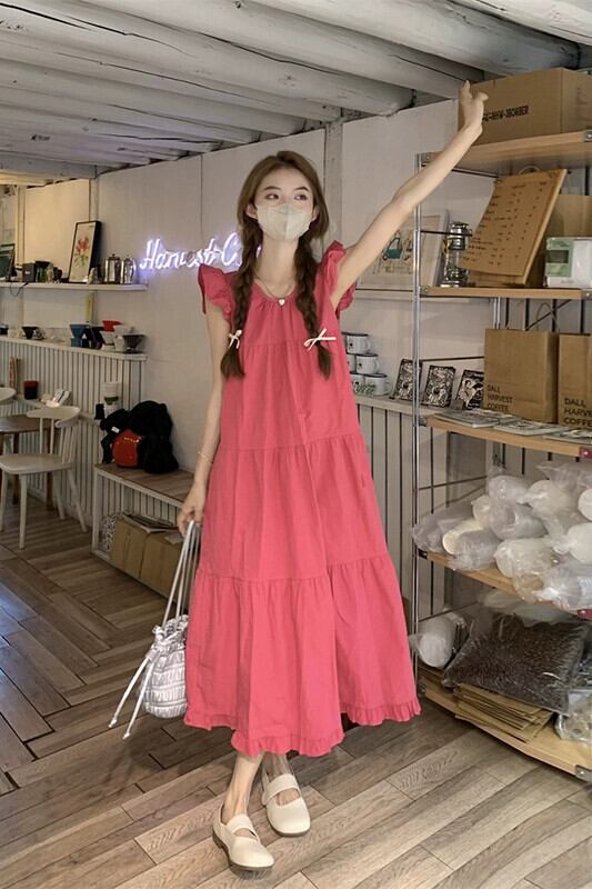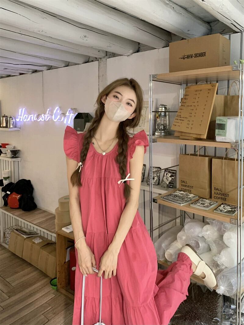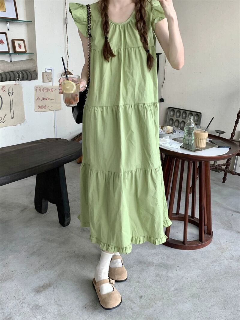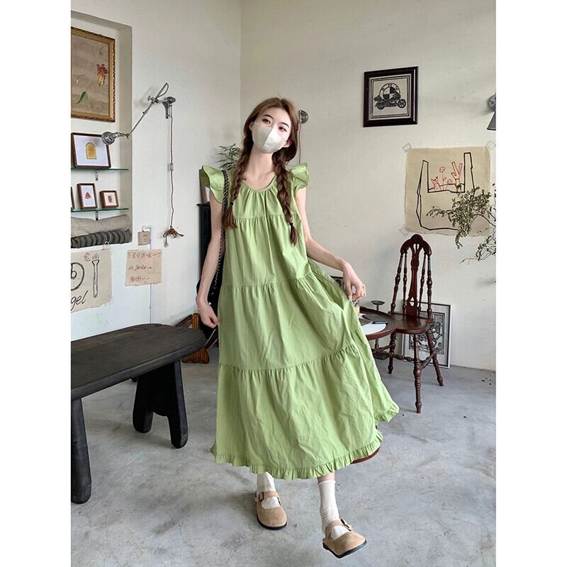 年齢を軽減する甘いスタイルのフライングスリーブドレスの女性の夏の新しいスタイルの新鮮なルーズデザインラウンドネックロングスカートシック 大人ガーリー スウィート キュート カジュアル サマー 夏物 Oネック missk68537080272