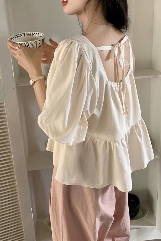 パフスリーブシャツレディース夏バージョン2023新しいスクエアネックバックレスレースデザインルーズ半袖トップ サマー 夏物 スクウェア missk58187214638