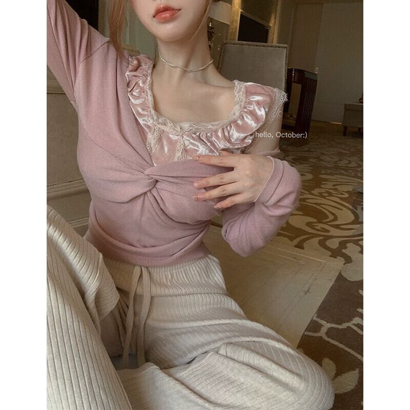 2023 秋の新スタイルの甘くてスパイシーなツイスト V ネック痩身ワンショルダーセーター気質ショートトップ女性 大人ガーリー スウィート キュート カジュアル オータム 秋物 Vネック missk52793767599