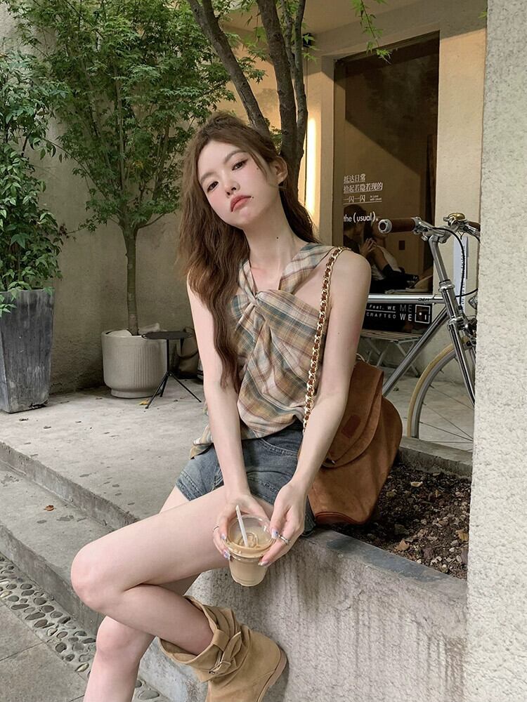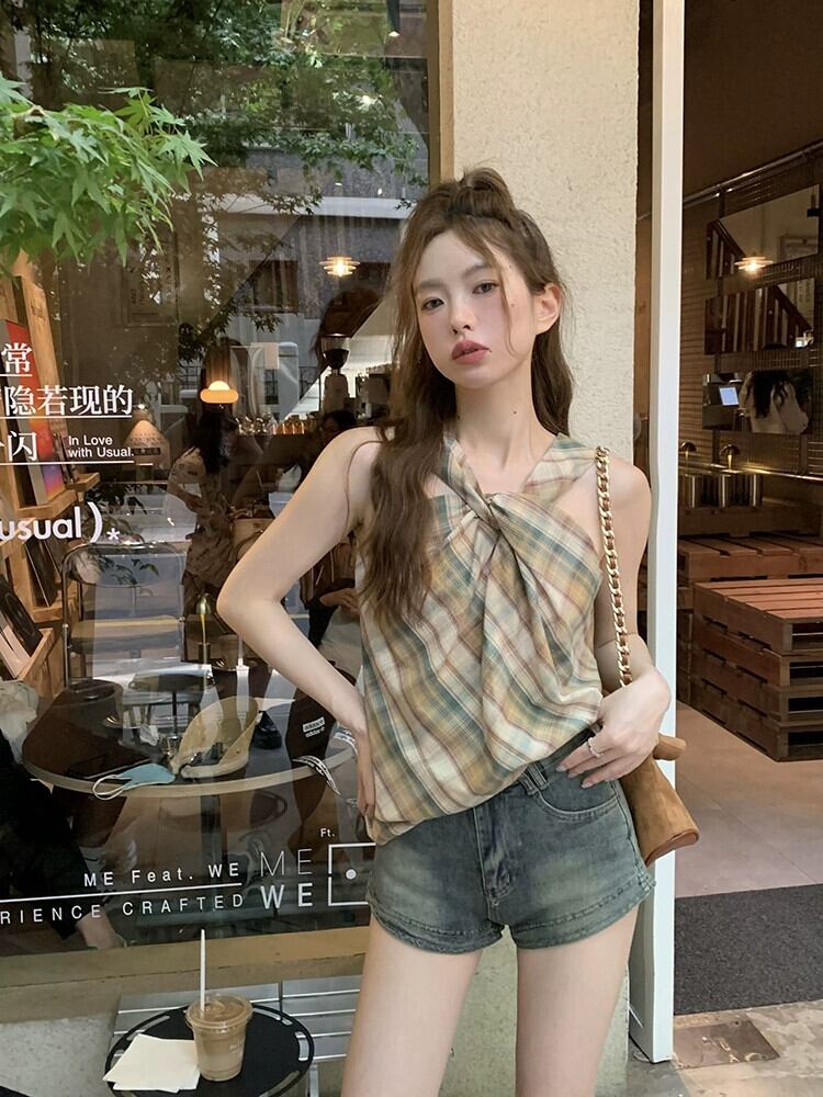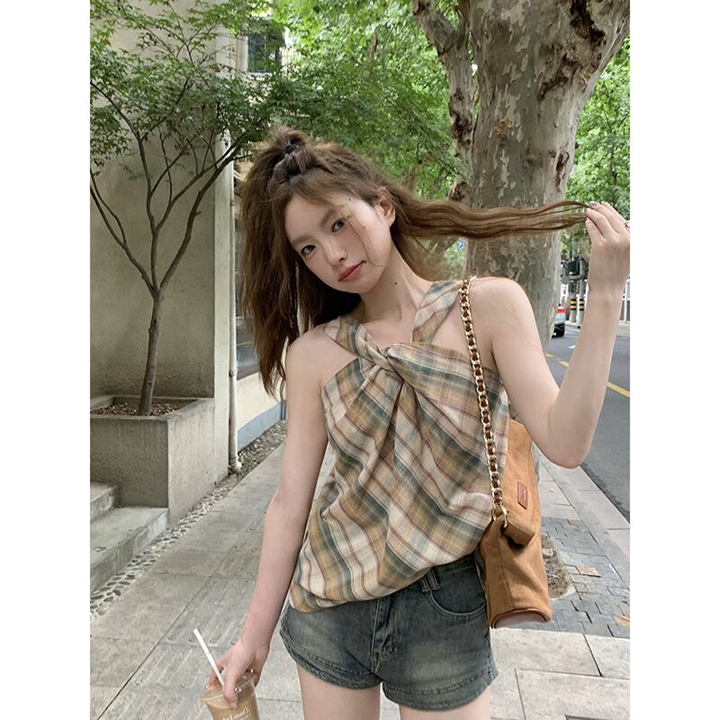 レトロチェック柄ベストサスペンダーレディース夏の新デザインニッチホルターネック気質ファッショナブルな年齢軽減トップ サマー 夏物 missk28002397246
