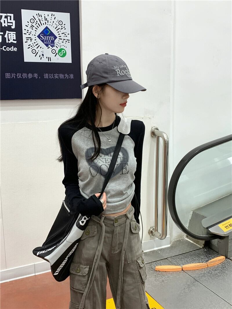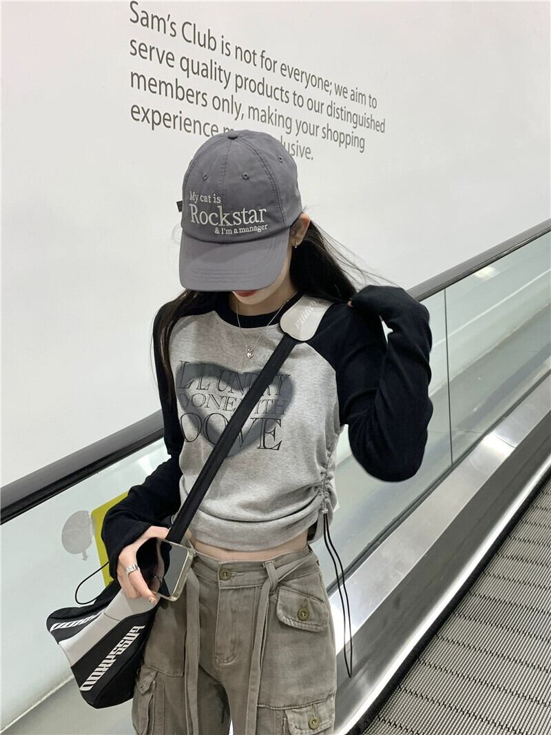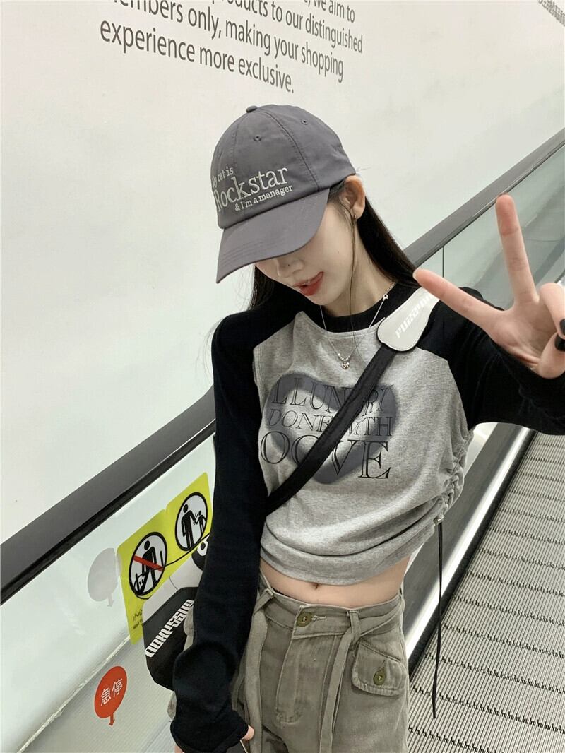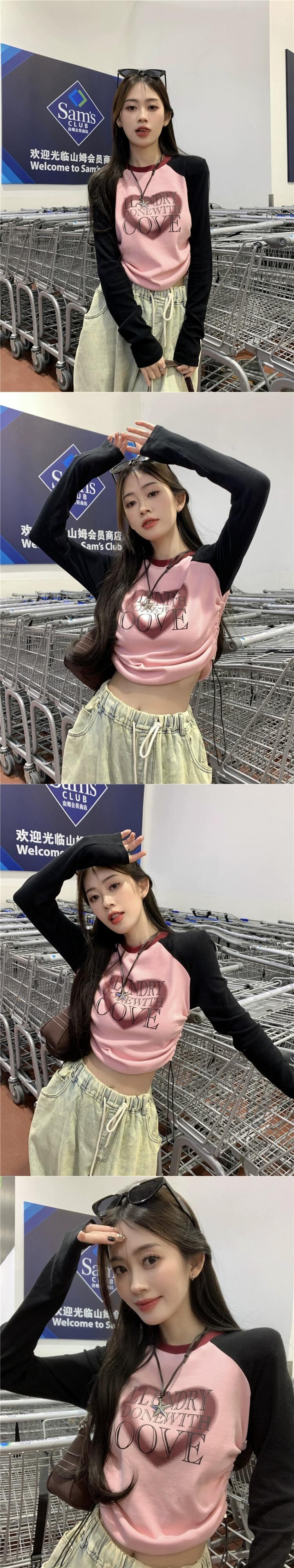 長袖 Tシャツの女性の夏の 2023 新しいスタイル対照的な色の愛のプリントスリムフィットショートプリーツトップイン ロング サマー 夏物 missk63847115258