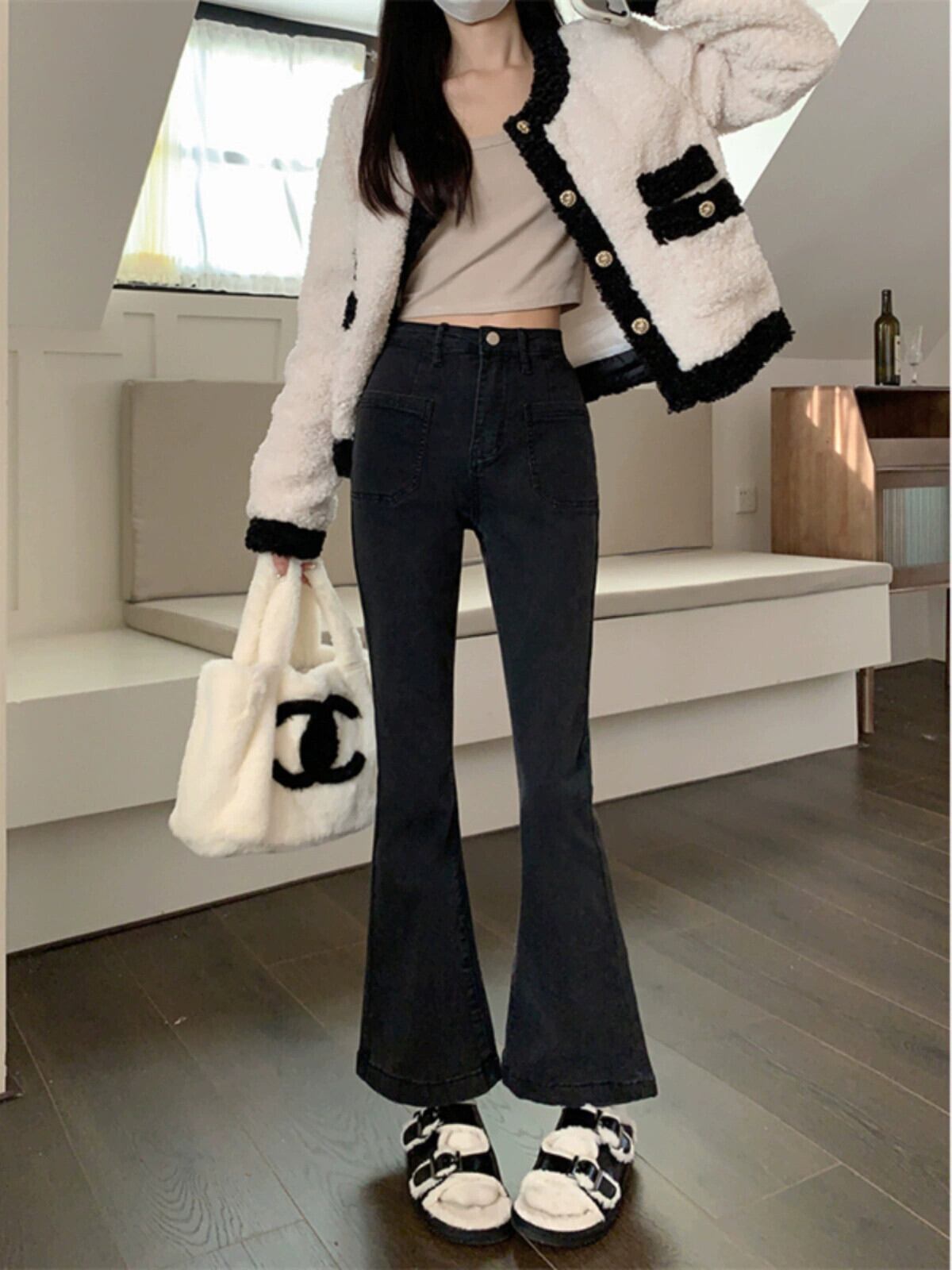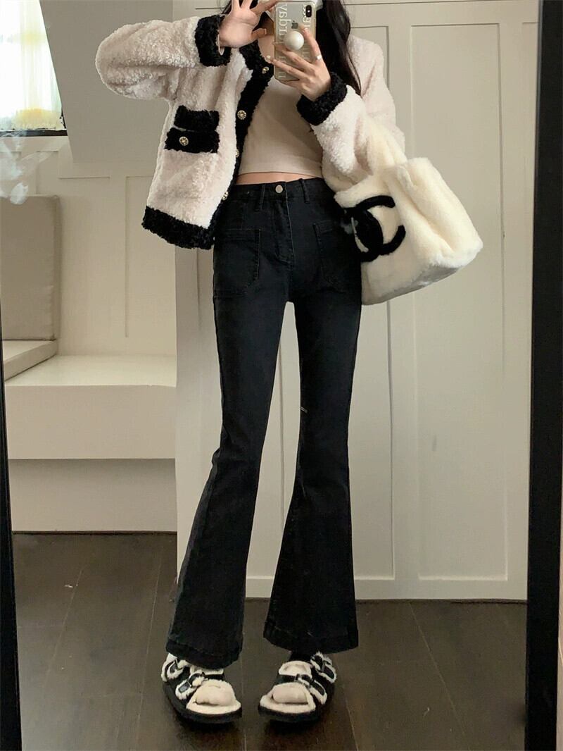 -2023年秋のウエスト少しブーツジーンズの女性の新しいスタイルのレトロスリムストレッチハイストリートスタイル多用途フレアロングパンツ レッド オータム 秋物 missk48441732465