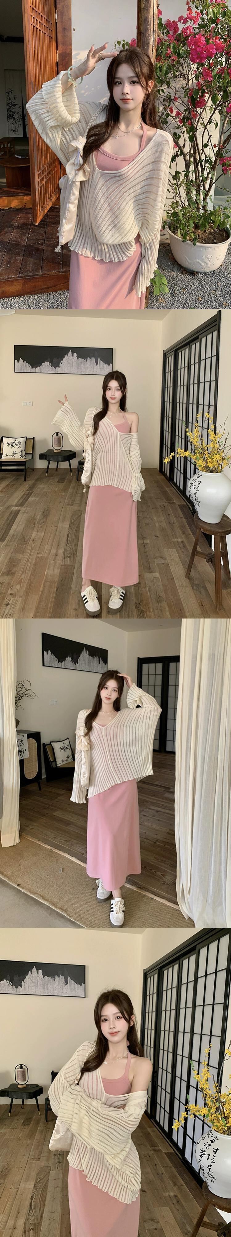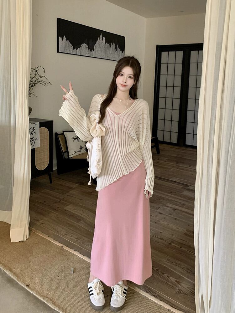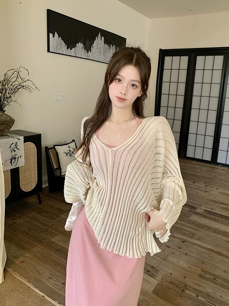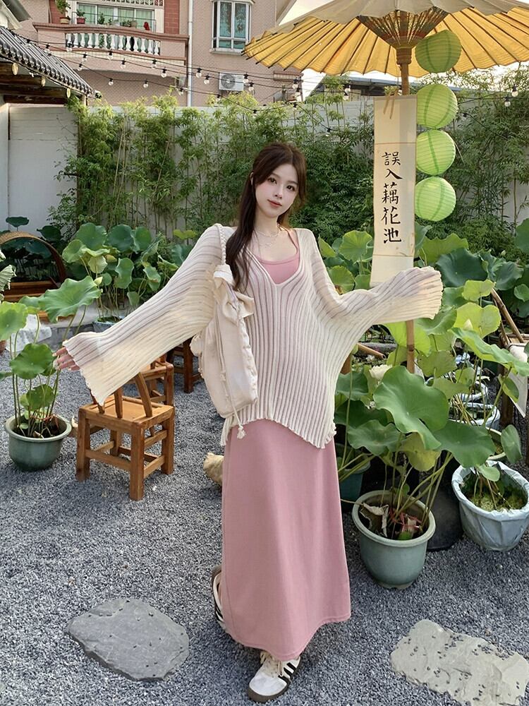 怠惰なスタイル V ネック薄い長袖日焼け止めブラウスサスペンダードレス女性の夏の 2023 新しいファッション 2 点セット ロング サマー 夏物 Vネック missk85876003048