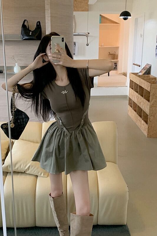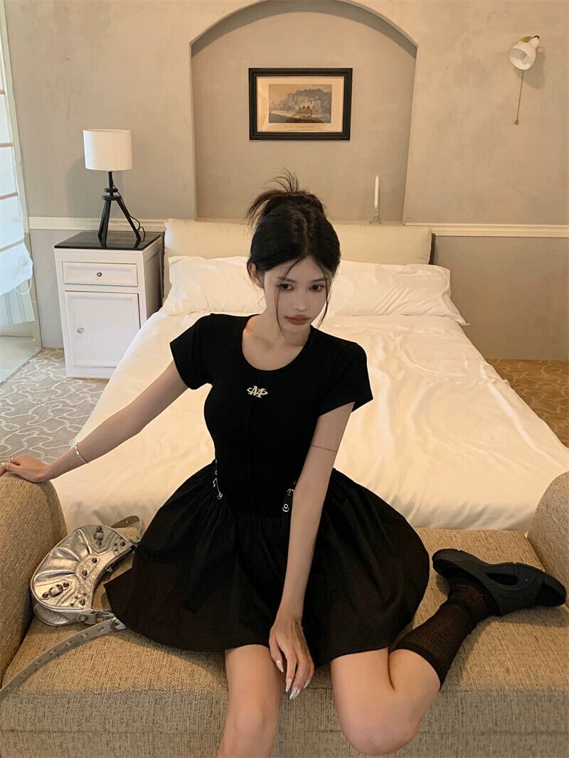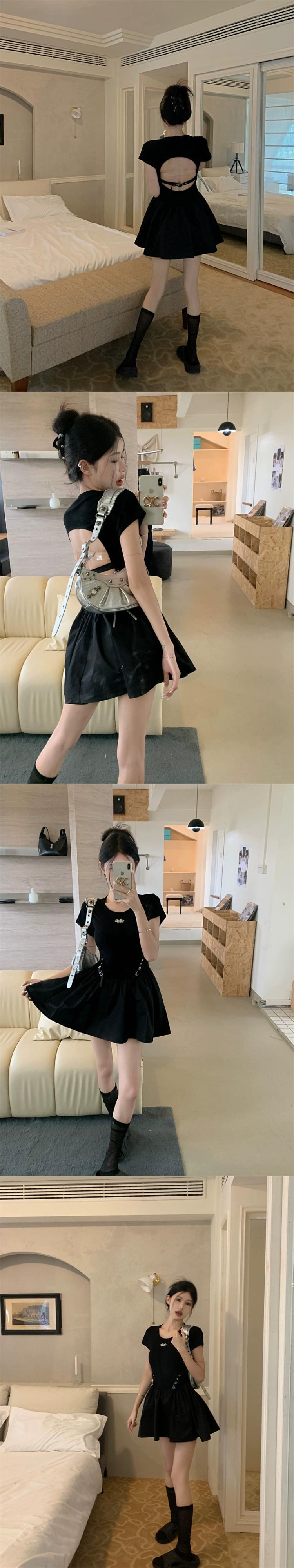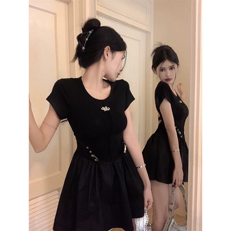 ホットスタイルスプライシング半袖ドレス女性夏 2023 新デザイン中空バックレス痩身スカート サマー 夏物 missk58331190803