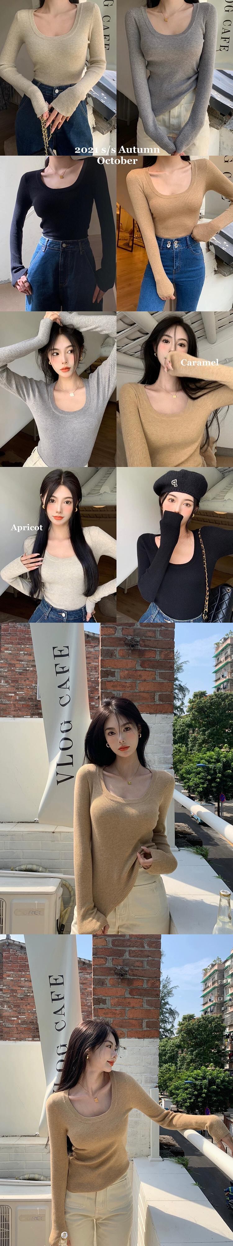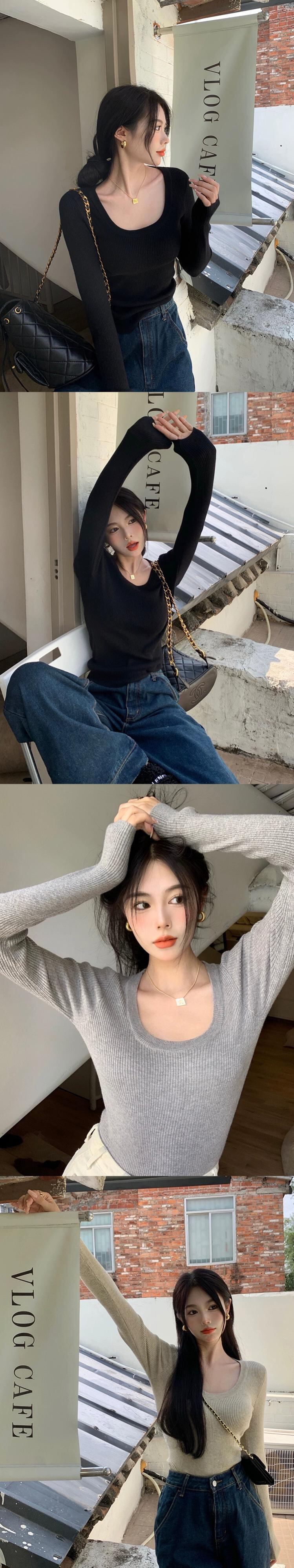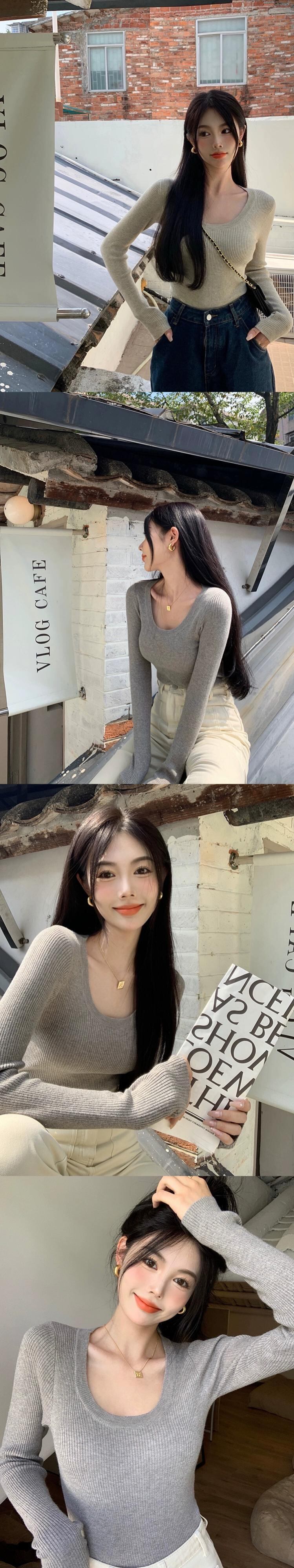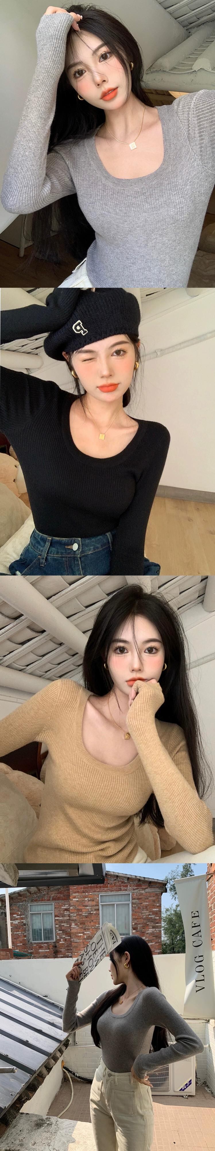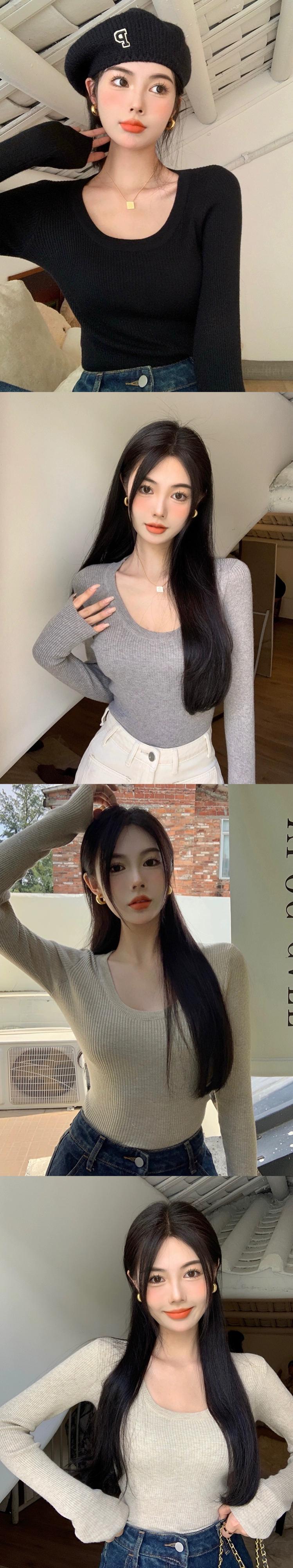 Uネックストレッチボトムセーターレディース、2023秋バージョン新しいスリムフィット、鎖骨露出長袖トップイン ロング オータム 秋物 missk28324665915
