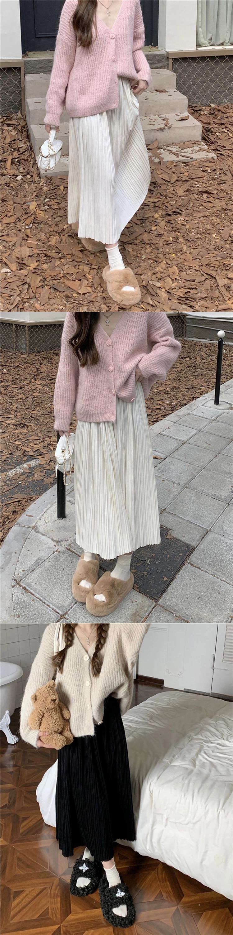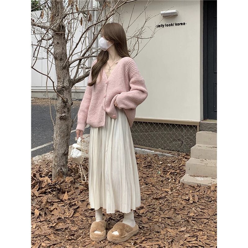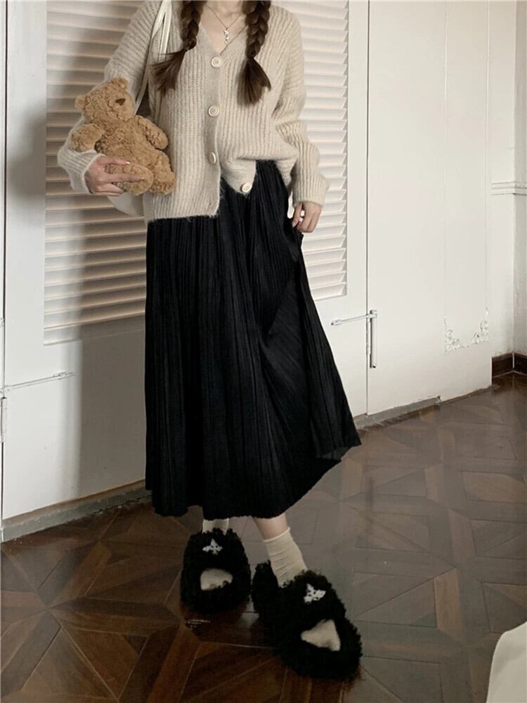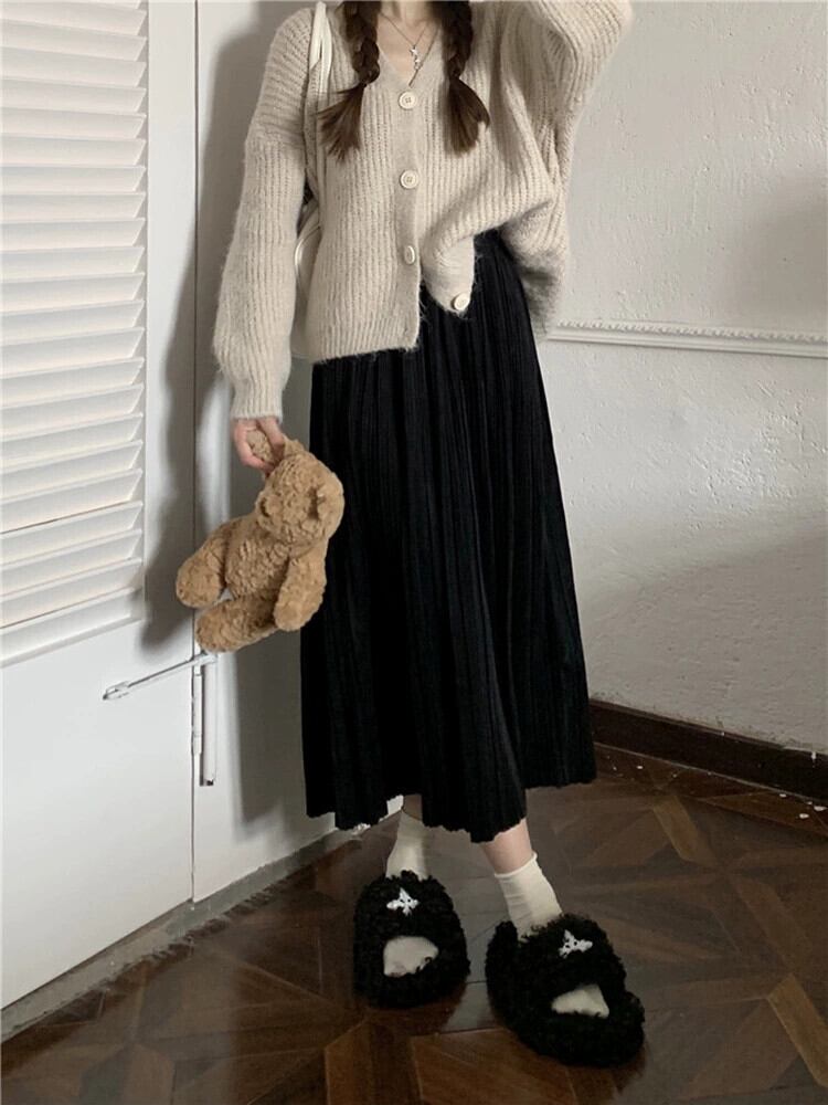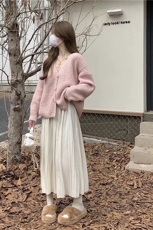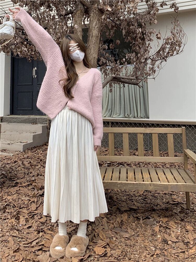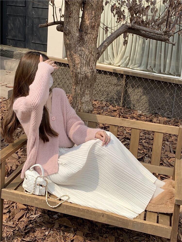 色:アプリコットスカート,黒スカート,ピンクのセーター,ミルクティーセーター