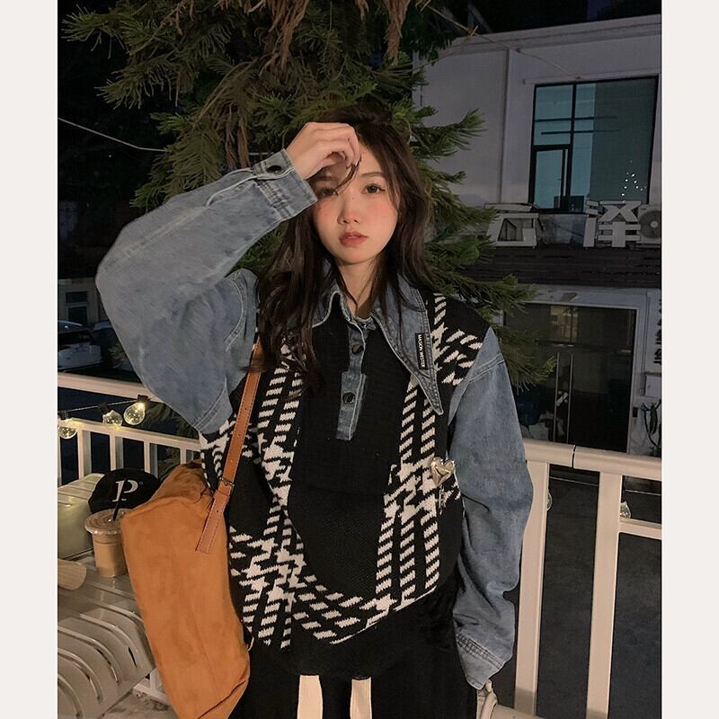 ニットスプライシング長袖デニムジャケット秋と冬の新しい緩いファッショナブルなデザインのユニークなミッドレングストップス女性 ロング オータム 秋物 ウィンター 冬物 missk30632239098