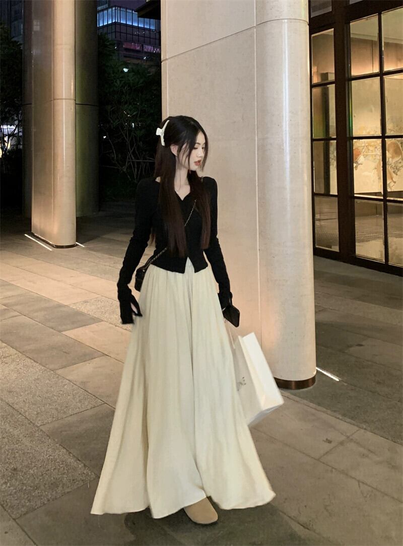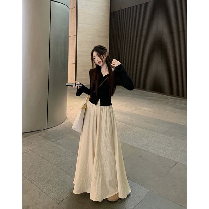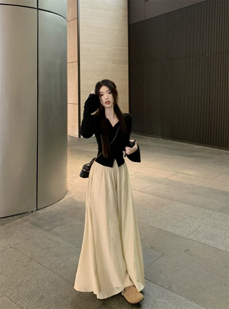 V ネック気質フレア長袖トップロングハイウエストワイドレッグキュロット女性秋 2023 新しいファッションツーピースセット レッド オータム 秋物 Vネック missk82253523133