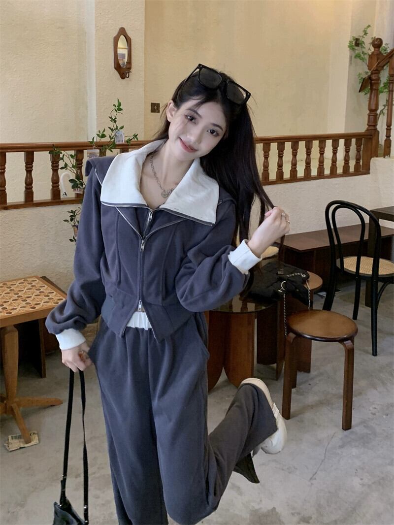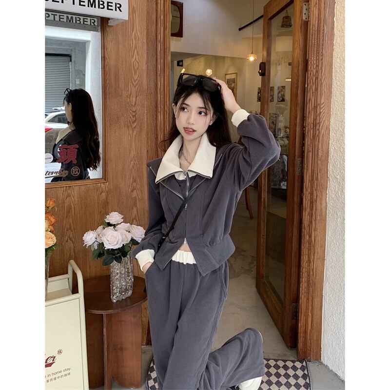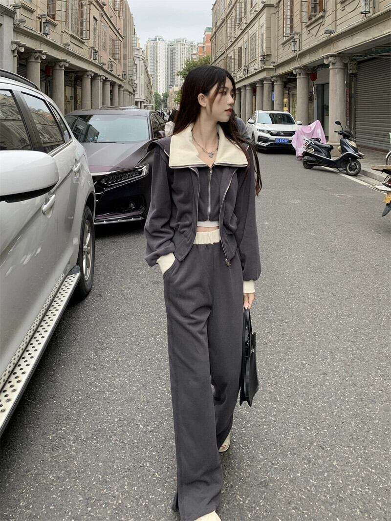 コントラストカラーラペルデザイン偽ツーピース長袖ジャケットワイドレッグスウェットパンツ女性の秋の2023新しいファッションスーツ ロング オータム 秋物 missk10047367303