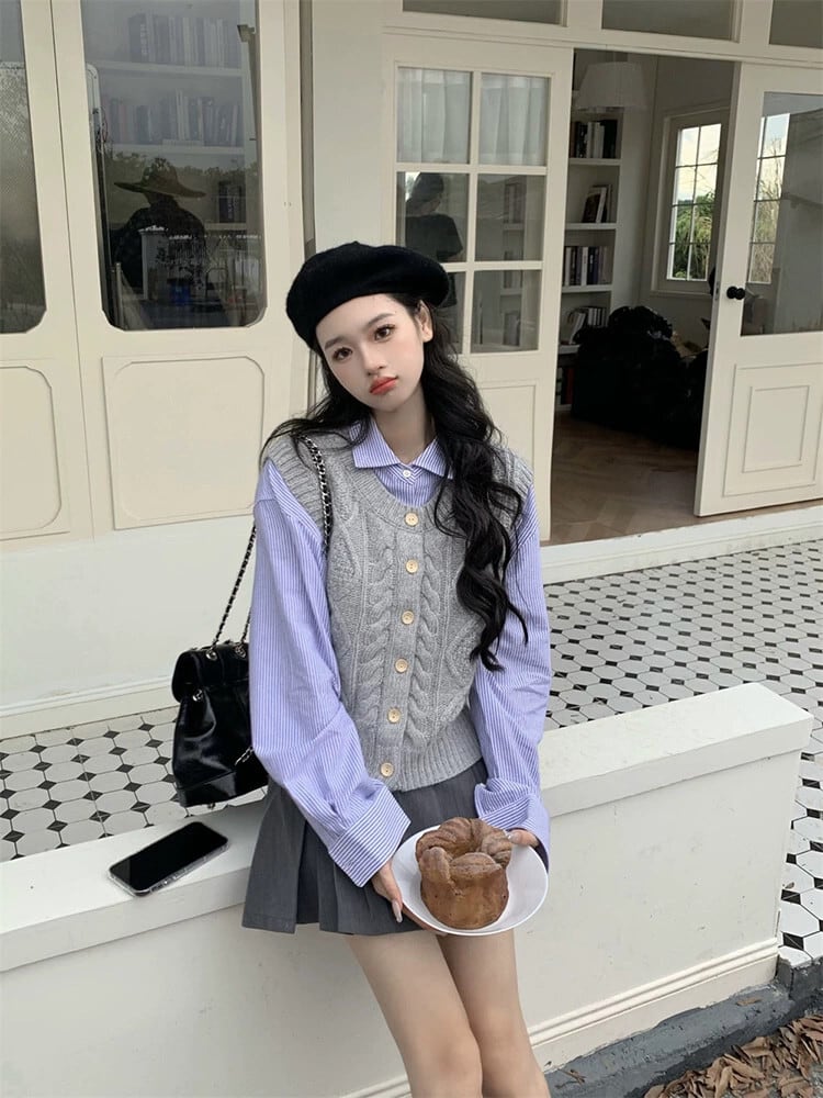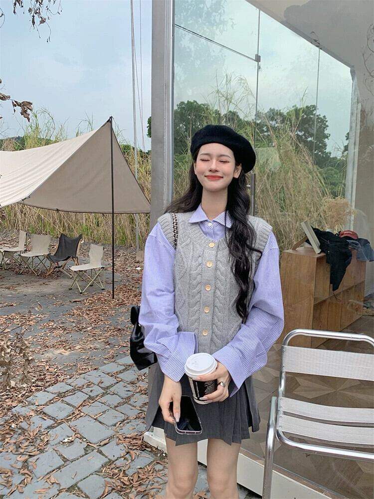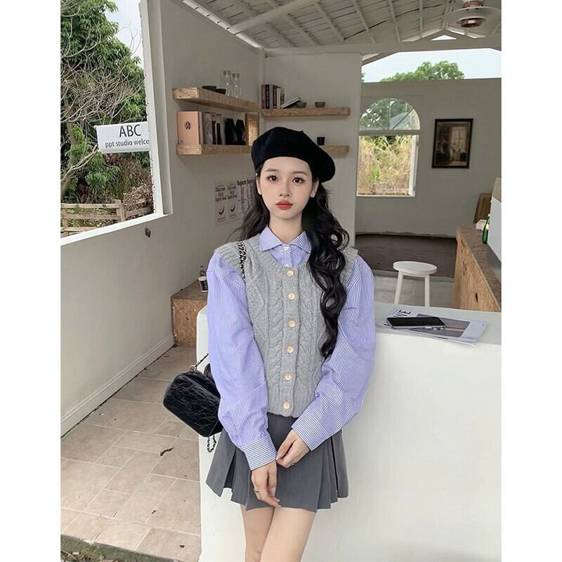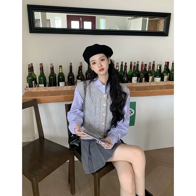 フレンチニッチツイストニットベストベストストライプ長袖シャツ女性2023秋の新ファッションツーピースセット ロング オータム 秋物 missk80909693369