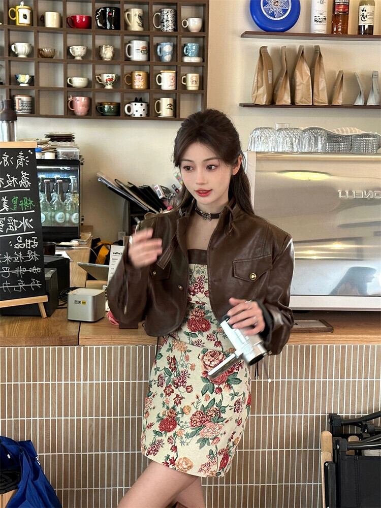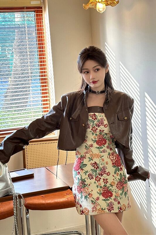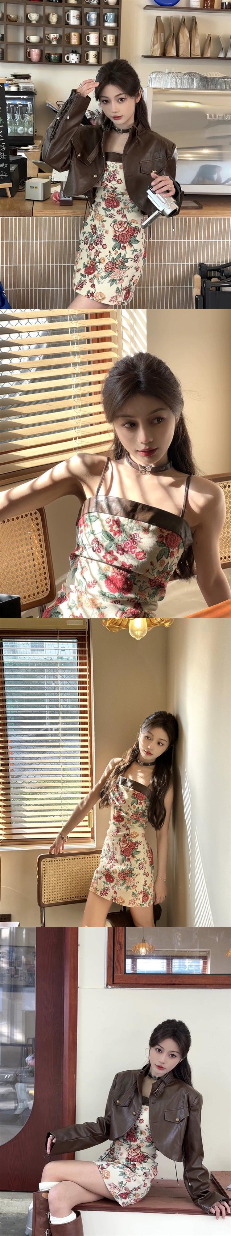 色:コーヒーカラーのレザージャケット,フローラルキャミソール