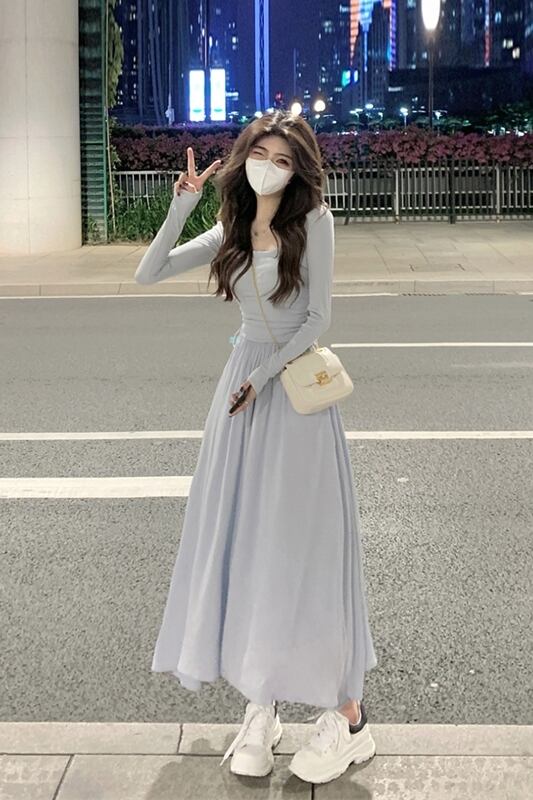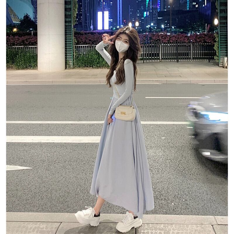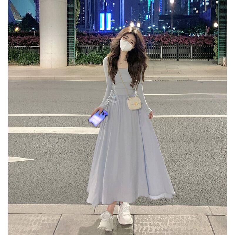 シックなスクエアカラー鎖骨長袖ドレスの女性の 2023 秋の新しいスタイルのスプライシング気質ミッドレングススリム A ラインスカート ロング オータム 秋物 Aライン スクウェア missk88646539438