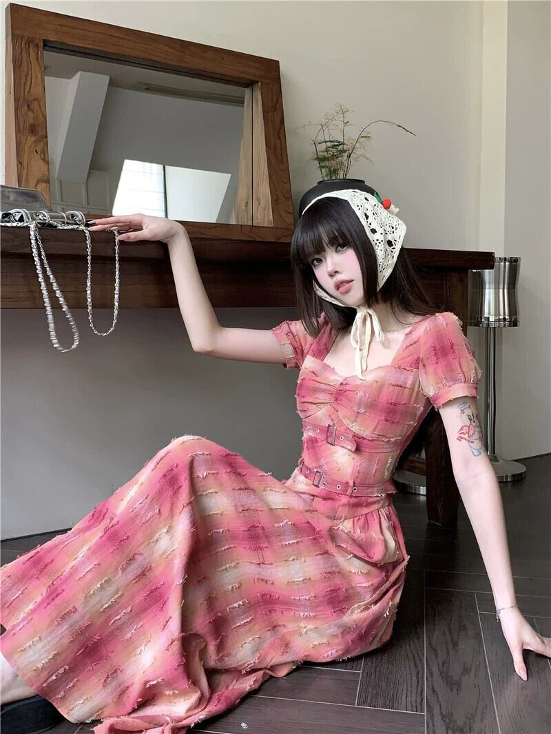 レトロチェック柄スクエアネックドレスレディース夏 2023 フレンチウエストパフスリーブミドル丈スカート サマー 夏物 スクウェア missk94208319328