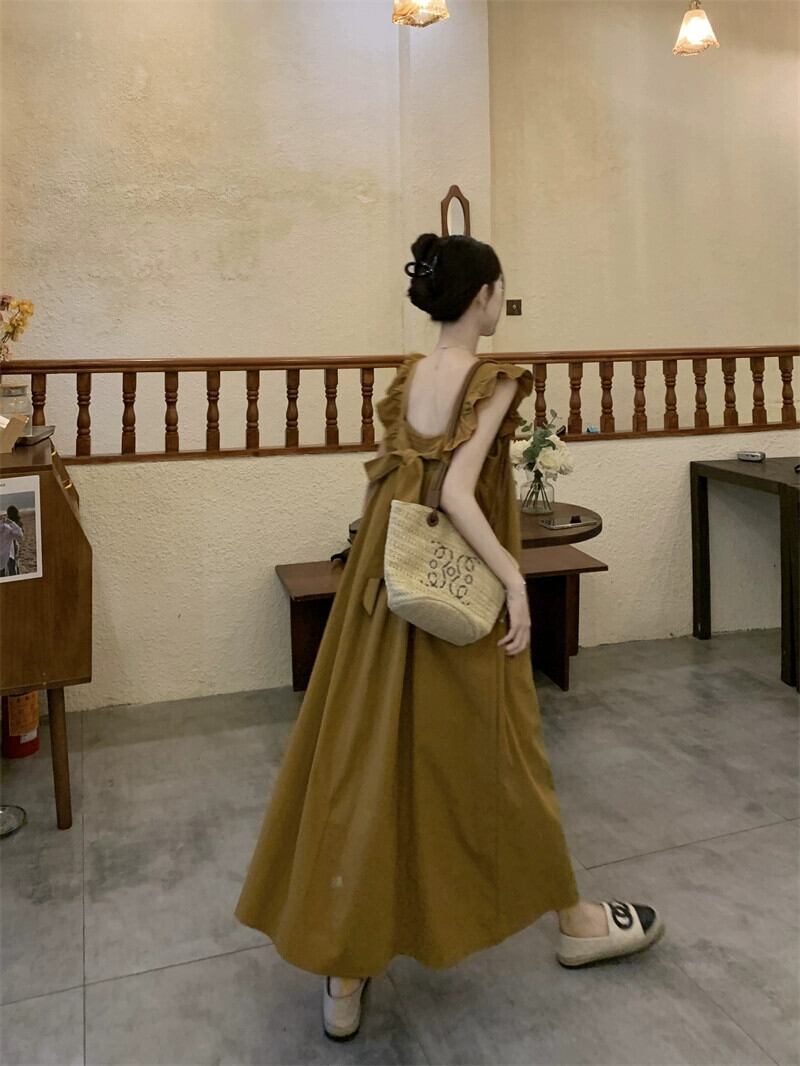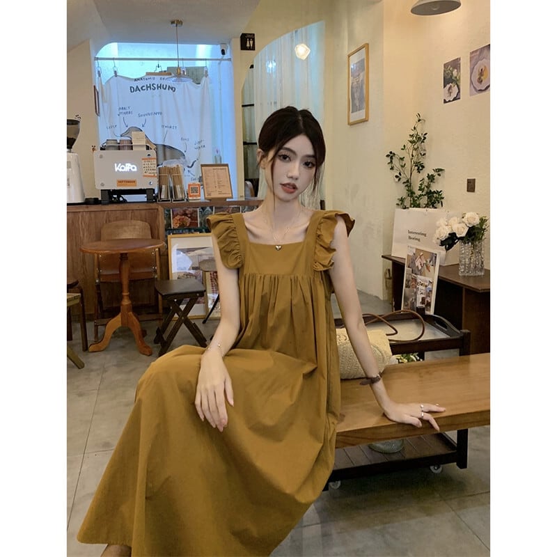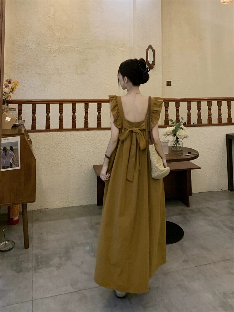 Feifei スリーブスクエアネックドレスの女性の夏 2023 新しいフレンチレトロバックレスストラップウエスト痩身ロングスカート サマー 夏物 スクウェア missk19768782437