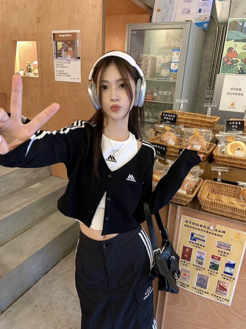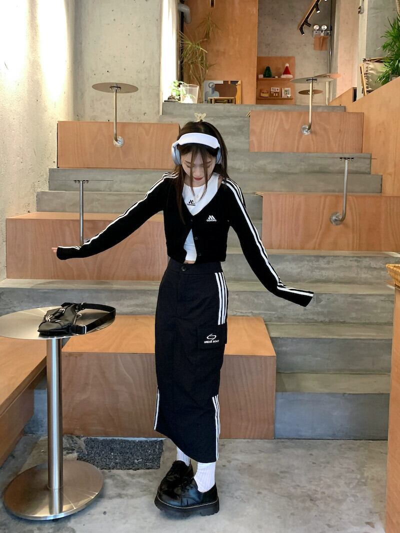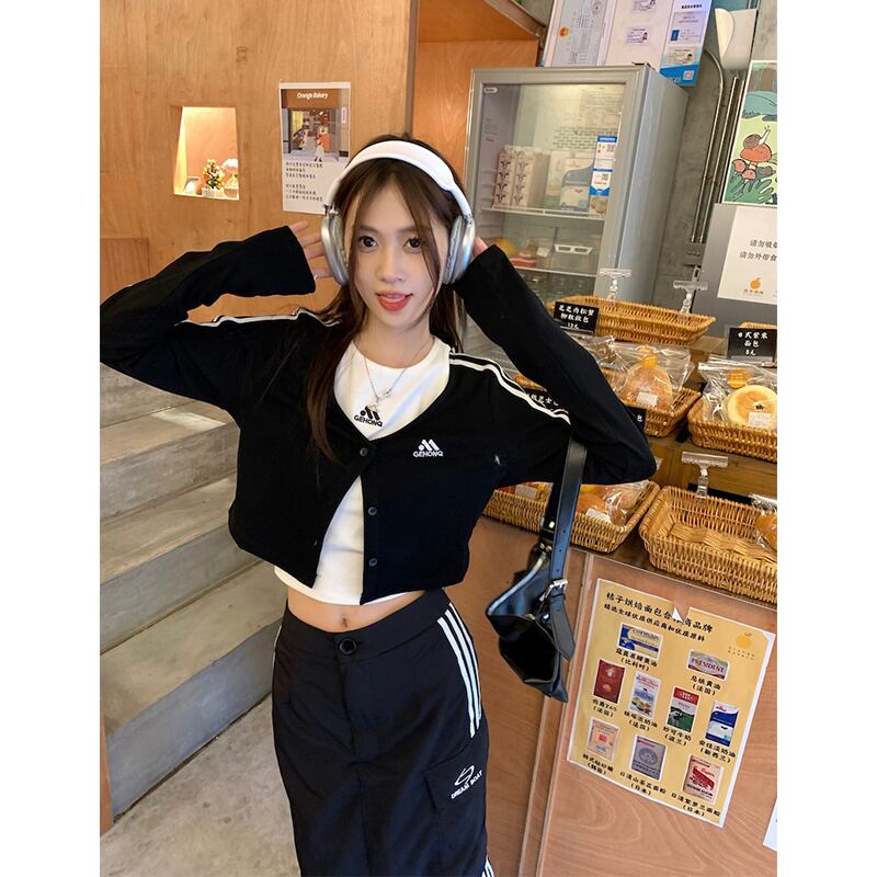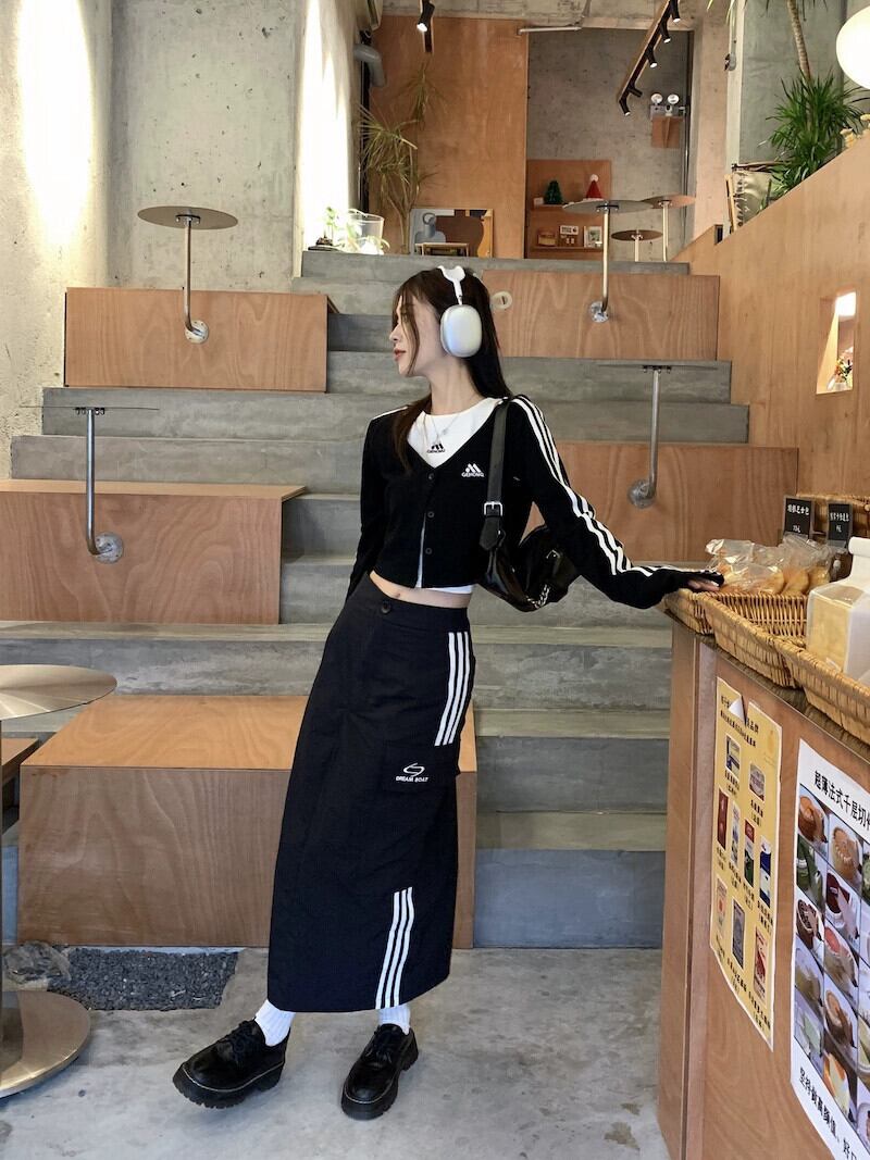 スポーツスタイルストライプコントラストショート長袖カーディガンベストロングスカート女性秋 2023 新しい 3 点セット オータム 秋物 missk41451532136