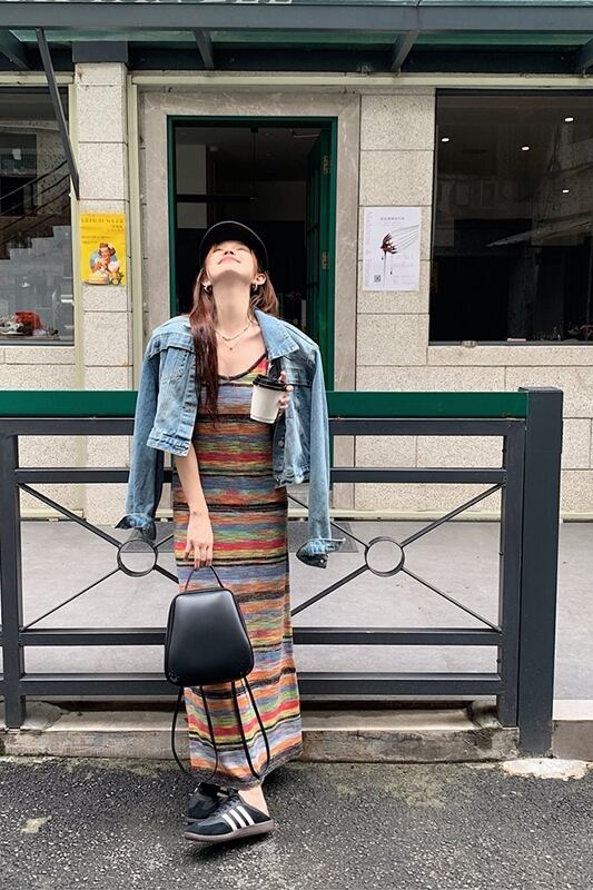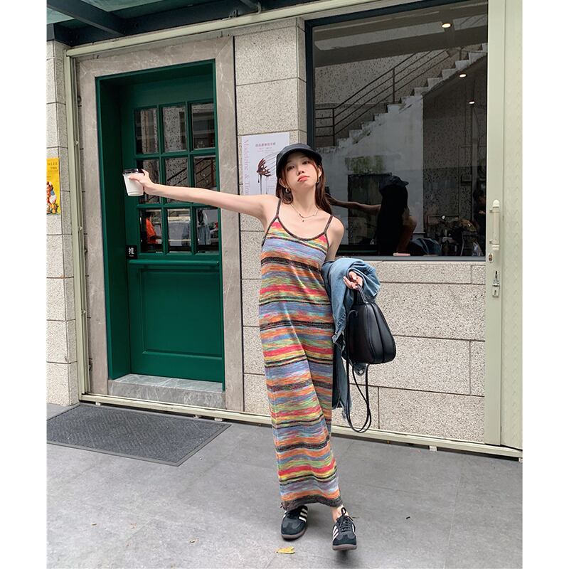 レインボーストライプニットサスペンダードレス女性初秋2023新しいスタイルフレンチレトロVネック対照的な色の気質ロングスカート オータム 秋物 missk50043875791