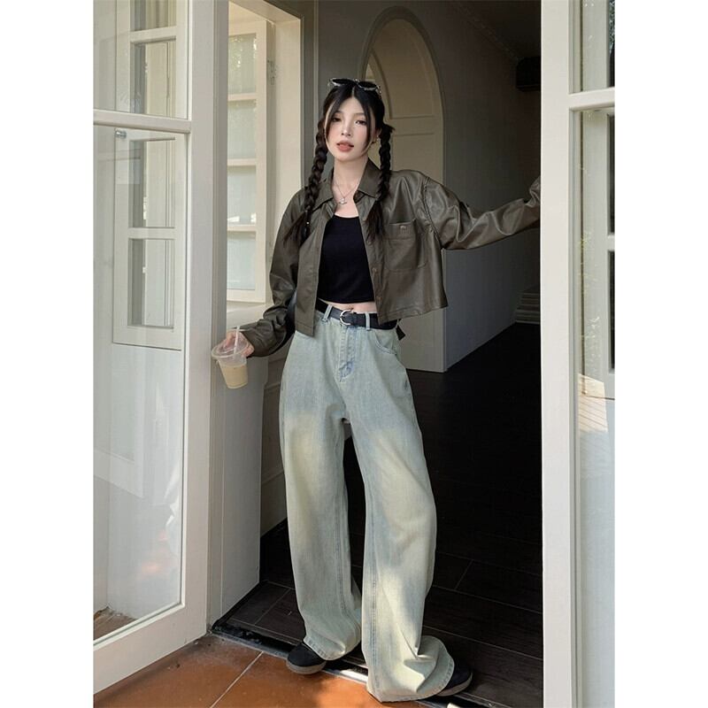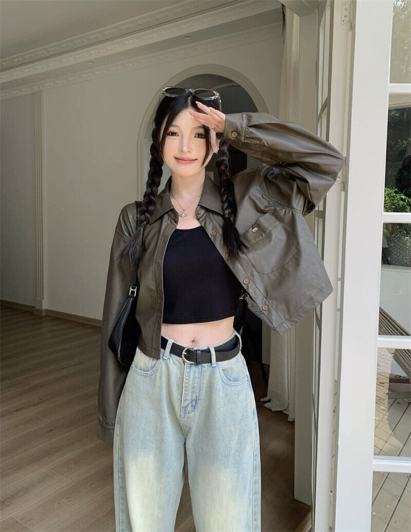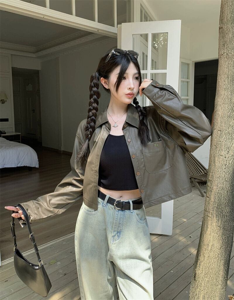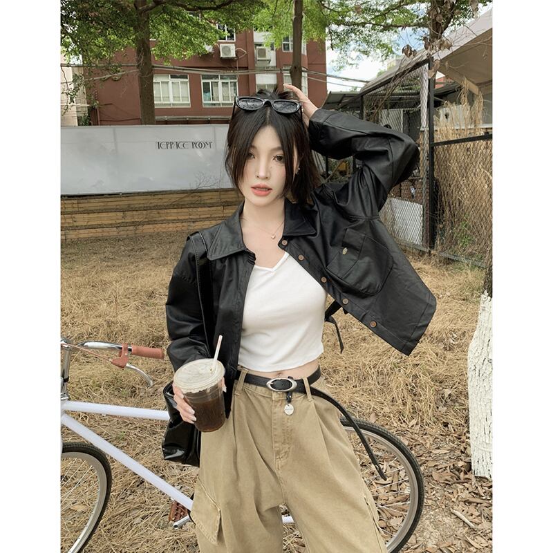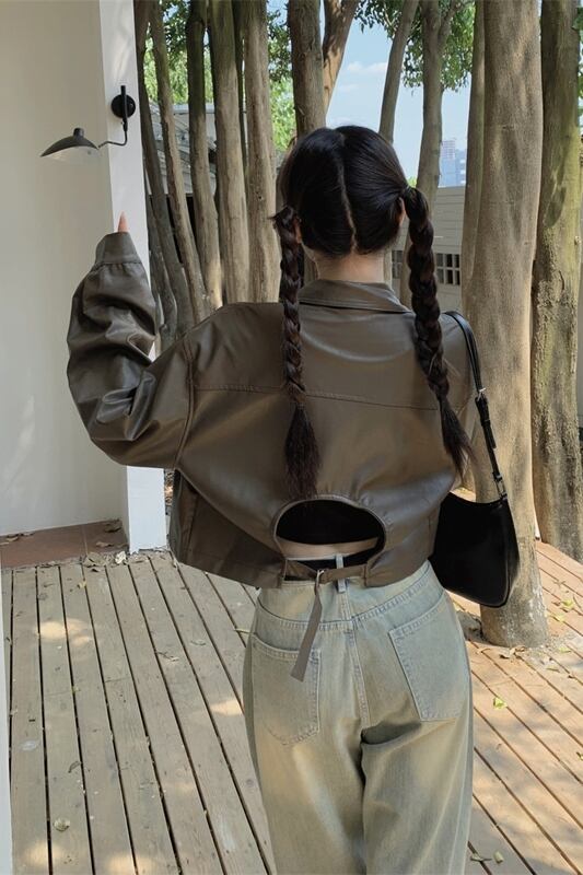 ショートレザージャケットレディース秋バージョン2023新しいバックレスデザインルーズ長袖ジャケットバイクウェアトレンド ロング オータム 秋物 missk82982914024