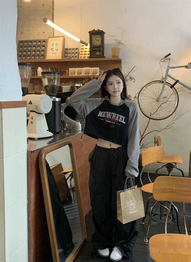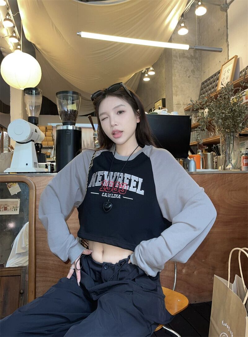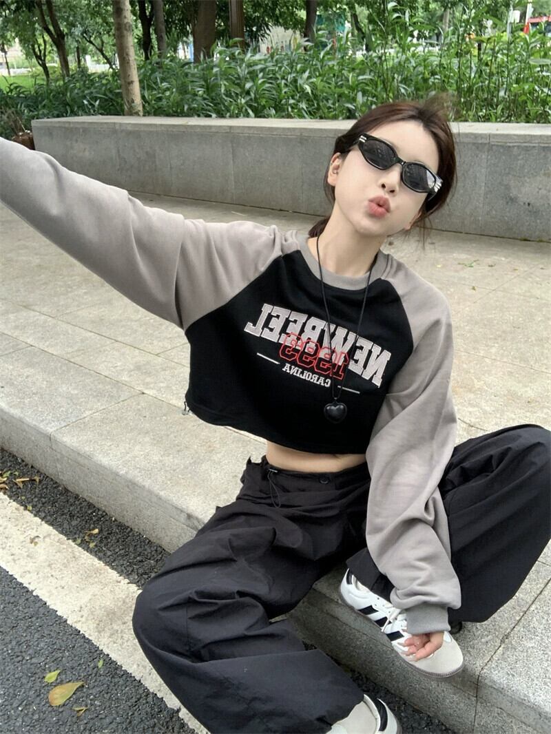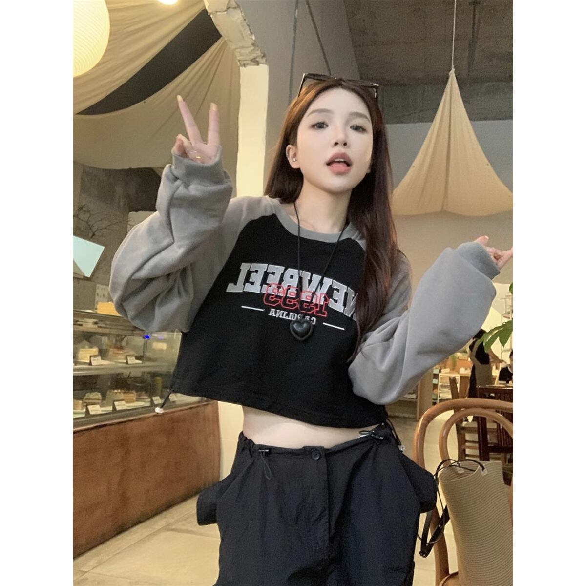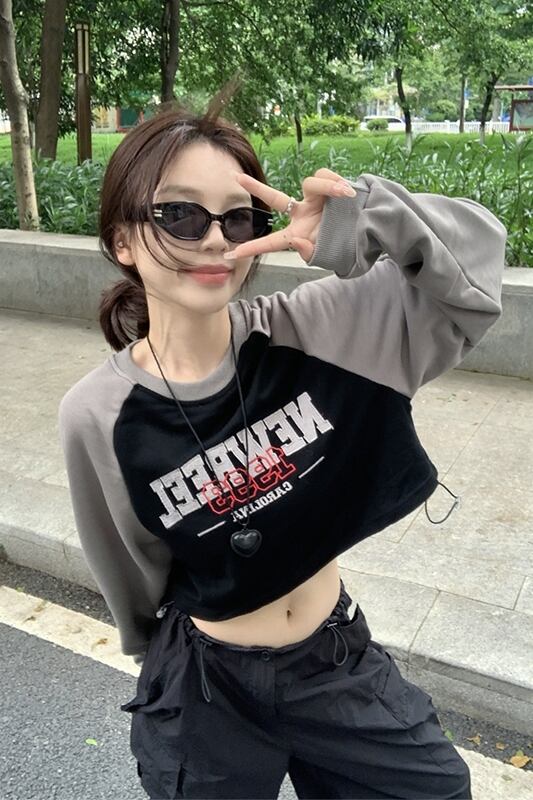 アメリカンレトロカラーブロックショートスウェットシャツ女性初秋2023新しい多用途ファッショナブルなプリント巾着長袖トップトレンディ ロング オータム 秋物 missk50827936609