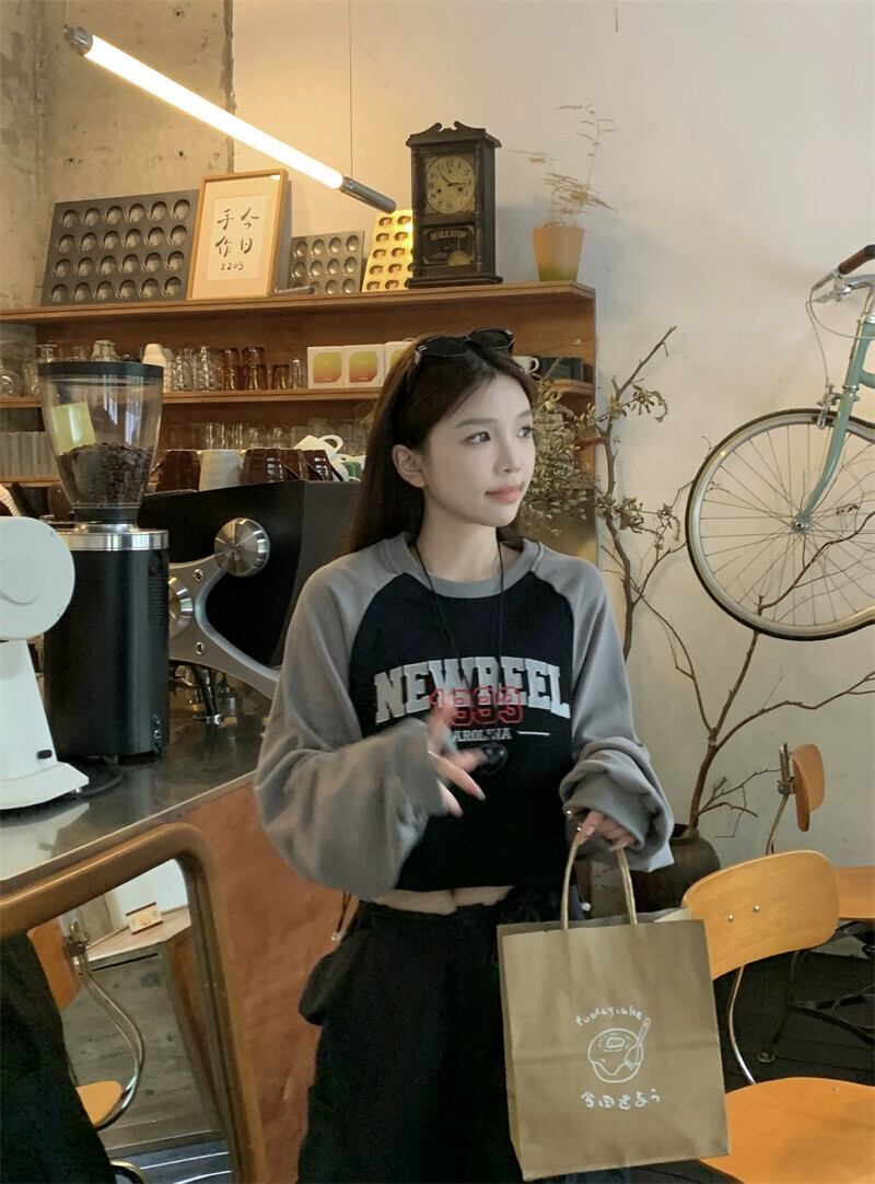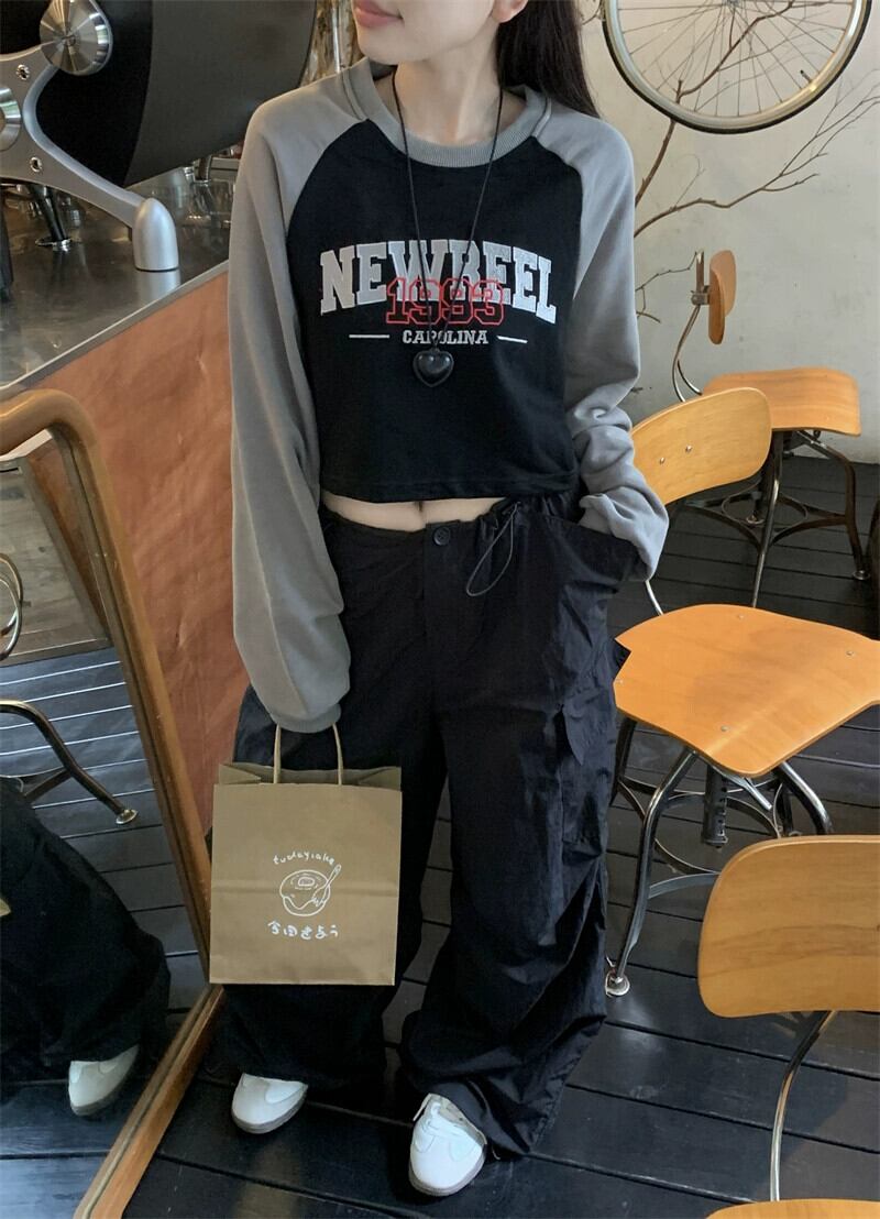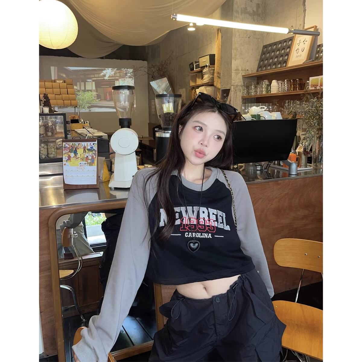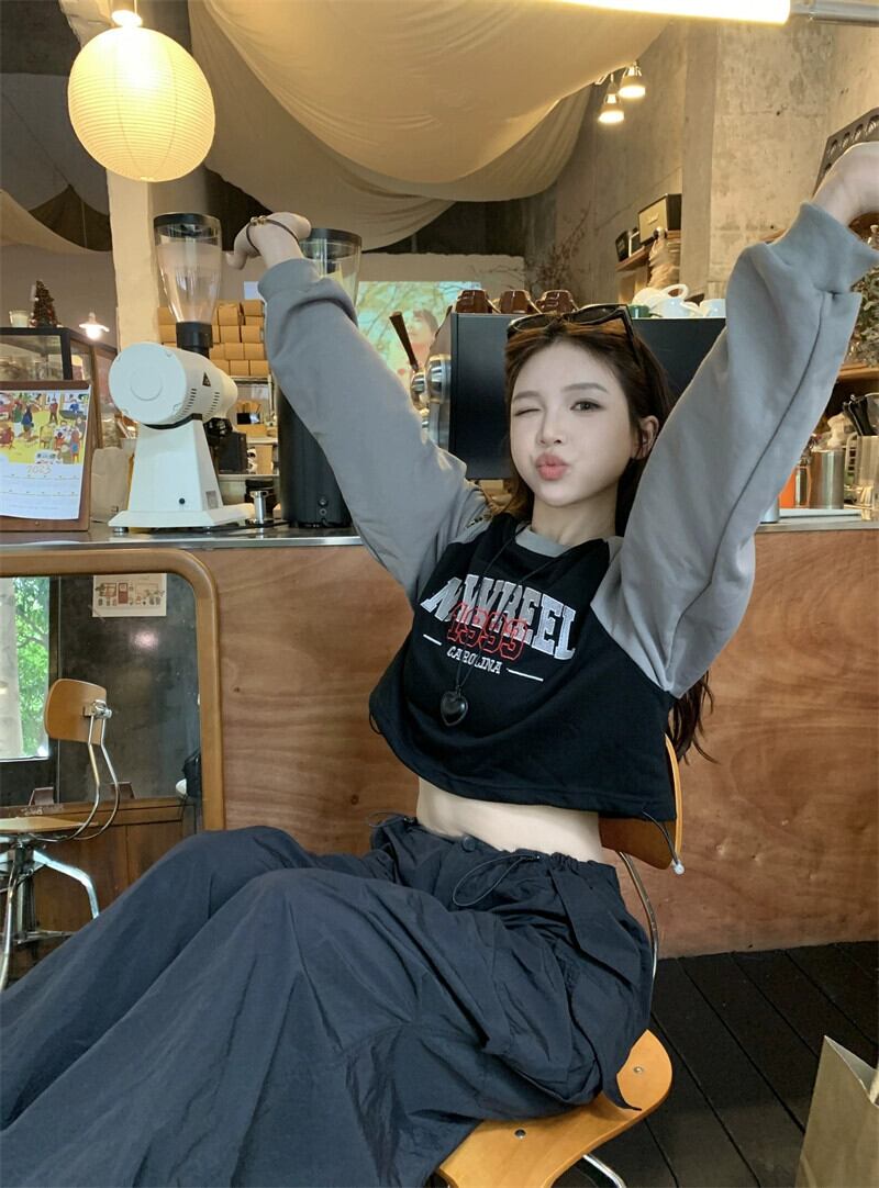 アメリカンレトロカラーブロックショートスウェットシャツ女性初秋2023新しい多用途ファッショナブルなプリント巾着長袖トップトレンディ ロング オータム 秋物 missk50827936609