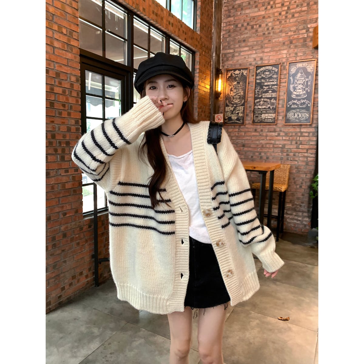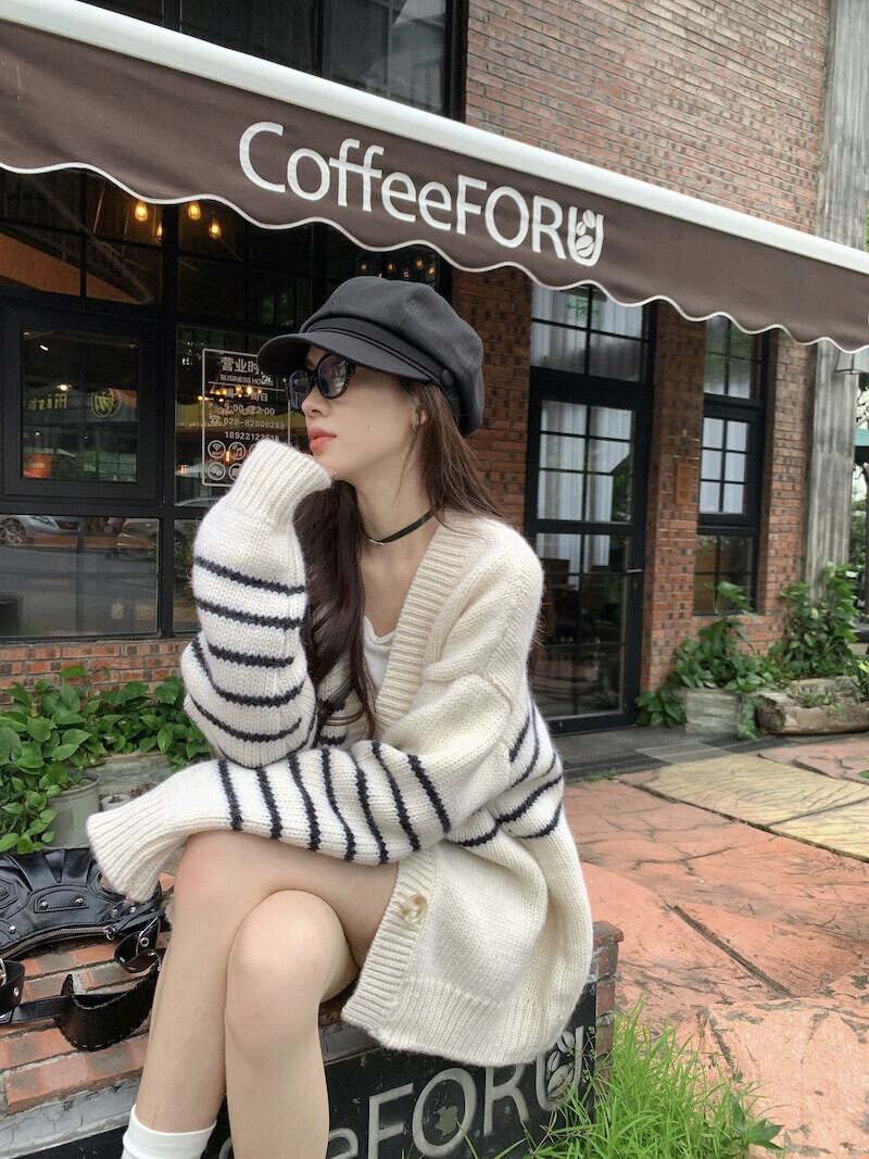 ストライプ長袖セータージャケット女性秋 2023 新レトロ怠惰なスタイル V ネックルーズ肥厚ニットカーディガン ロング オータム 秋物 Vネック missk92887233933
