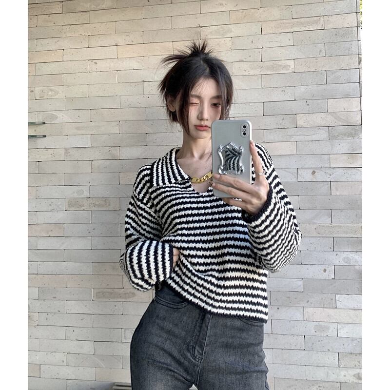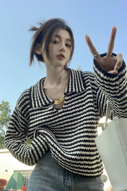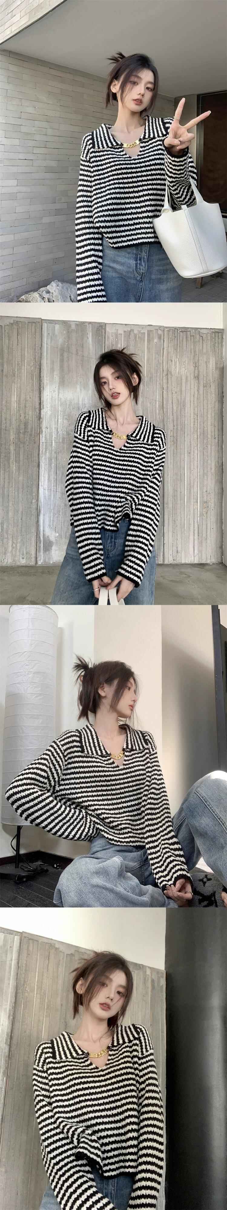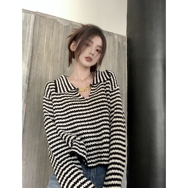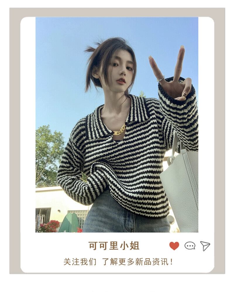 ストライプラペルセーター女性秋 2023 新デザインメタルチェーンフレンチニッチ長袖ニットトップ ロング オータム 秋物 missk61324414186