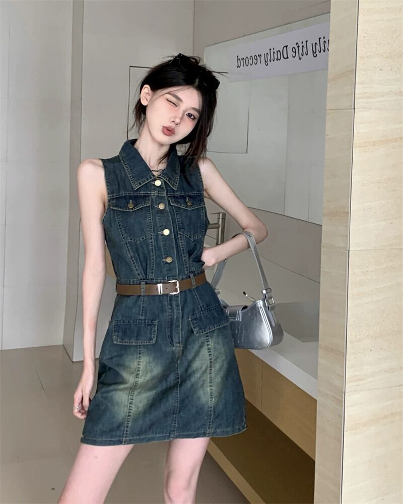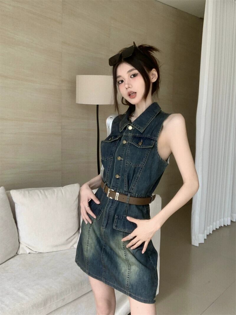 アメリカンデニムベストドレス夏2023新しいレトロラペルセクシーなウエスト痩身ショートスカート サマー 夏物 missk36089682740