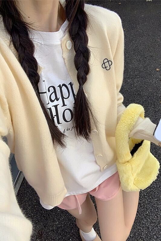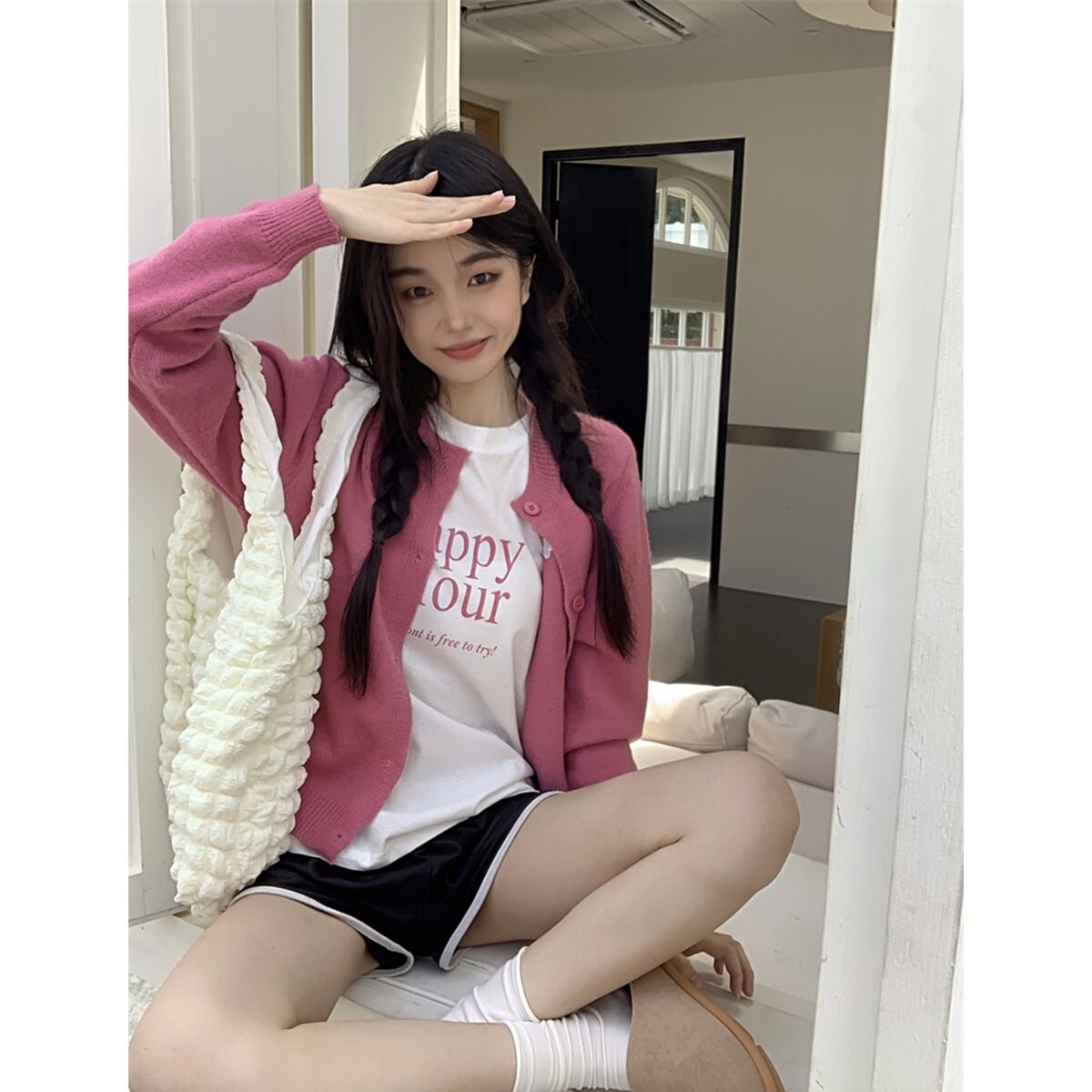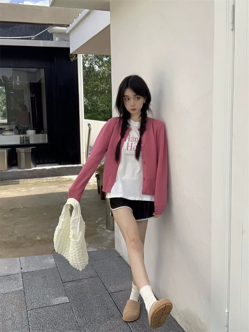 色:キャラメルカーディガン,キャラメル文字T,ローズピンクカーディガン,ピンクの文字T,アプリコットカーディガン,黒文字T,ブラックカーディガン