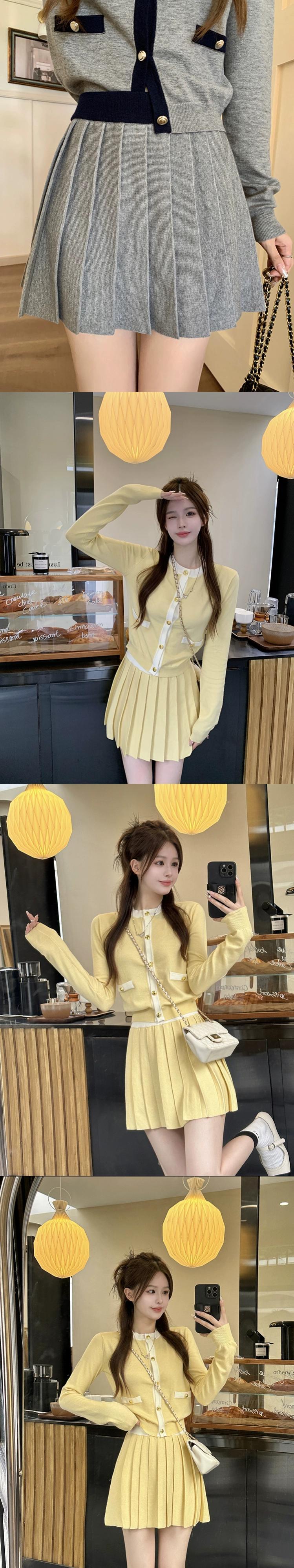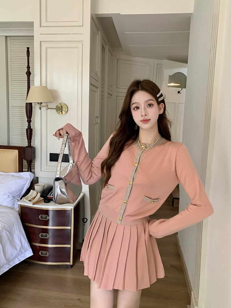 Xiaoxiangfeng 長袖コントラストカラーニットカーディガンハイウエストプリーツ A ラインスカート女性秋の新ファッション娘スーツ ロング オータム 秋物 Aライン missk70710504046
