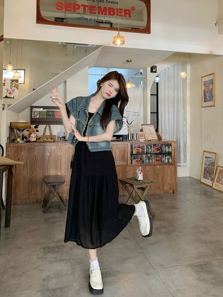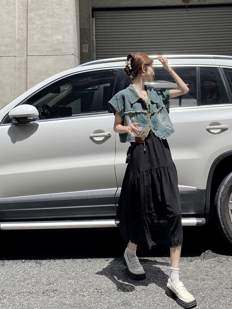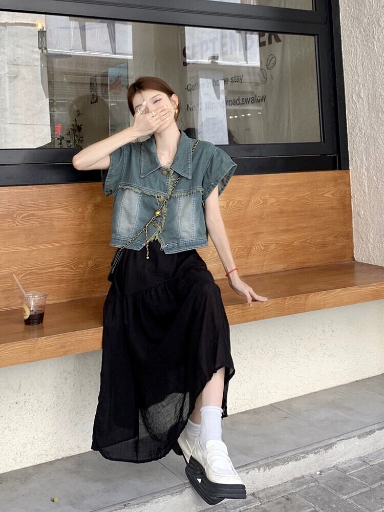 2023 夏の新スタイルレトロスタイルラペルローエッジデニム半袖ジャケット + サスペンダードレスの女性のファッションスーツ サマー 夏物 missk94276088362