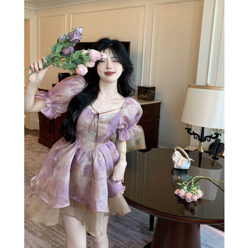 パフスリーブスクエアネック花柄プリンセススカート女性の夏 2023 新スタイルスーパー妖精デザインウエスト痩身ふくらはぎスカート サマー 夏物 スクウェア missk53172536132