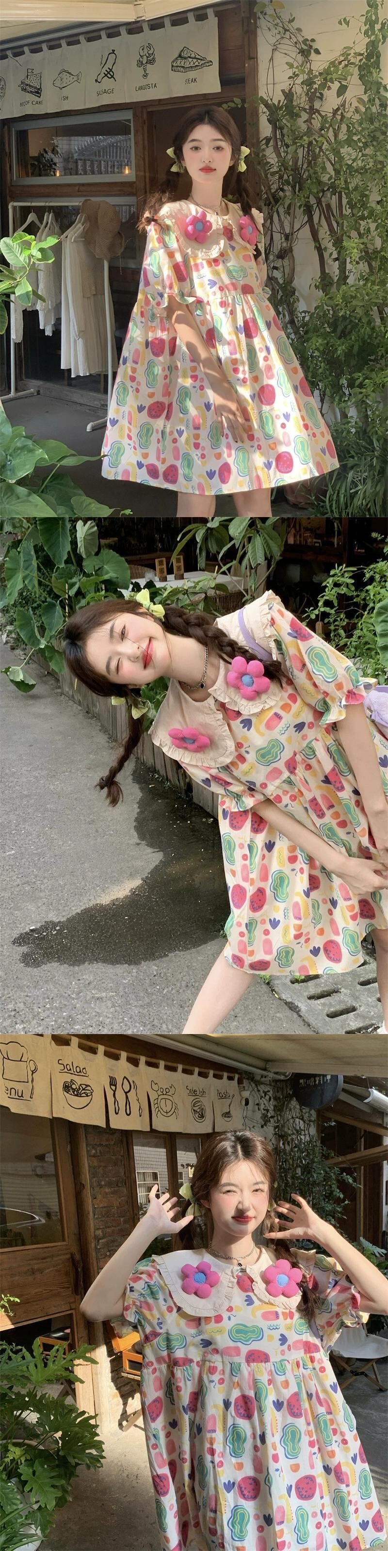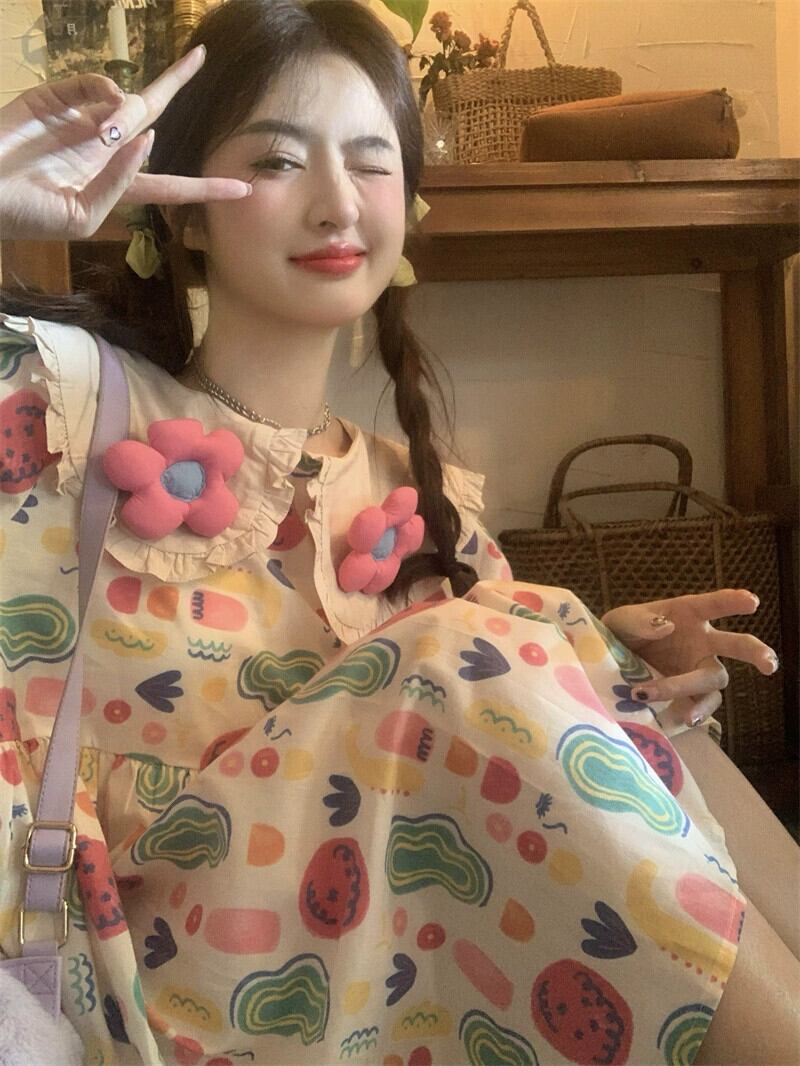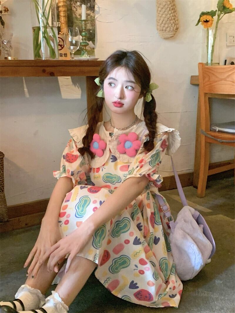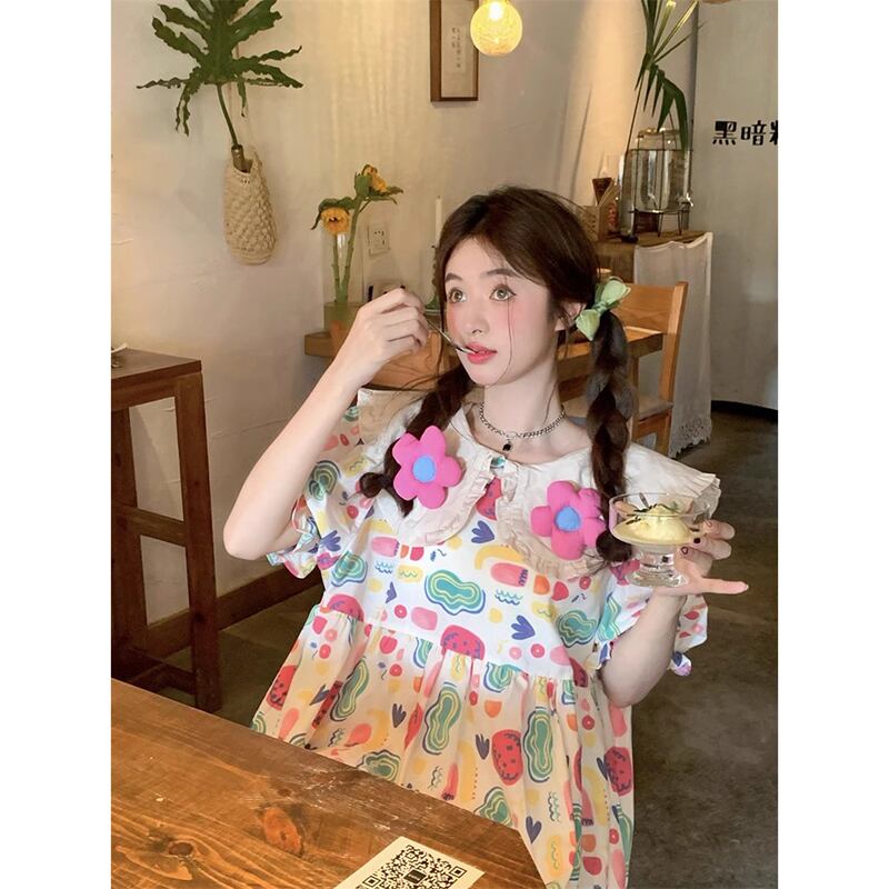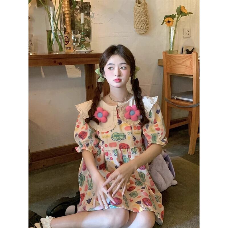 2023 夏の新スタイル甘いスタイルのデザインニッチ人格年齢を軽減するプリント人形の襟パフスリーブドレス女性 大人ガーリー スウィート キュート カジュアル サマー 夏物 missk59491497677