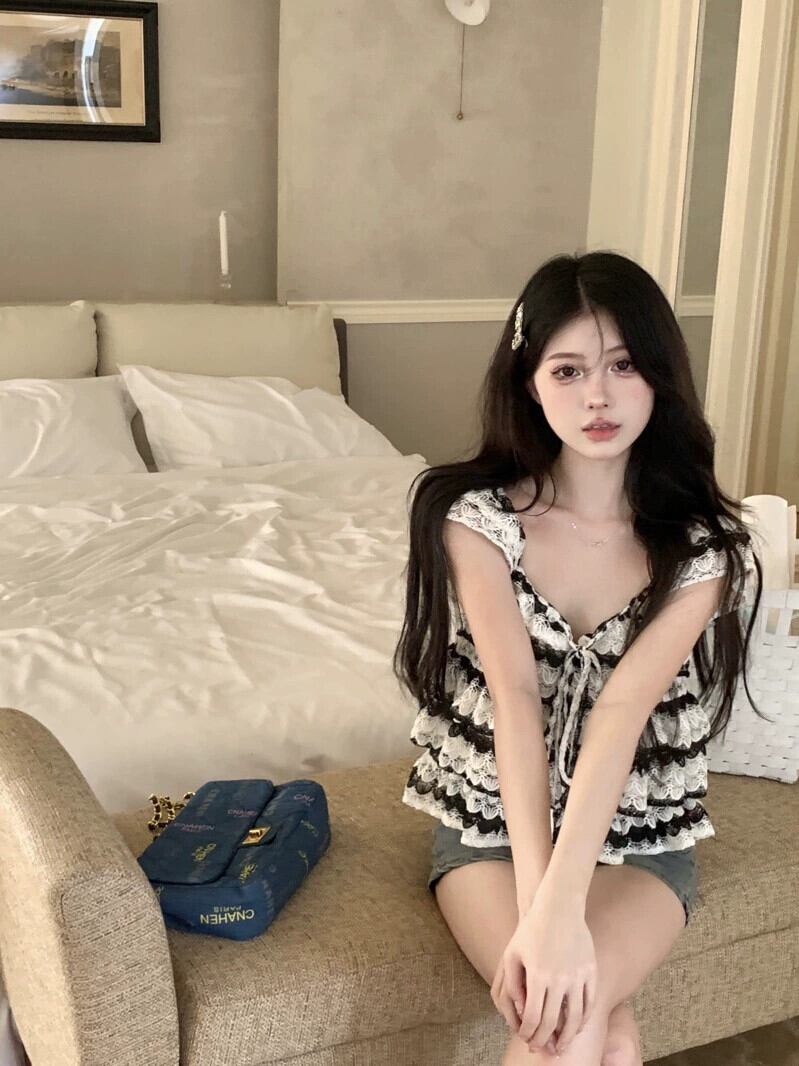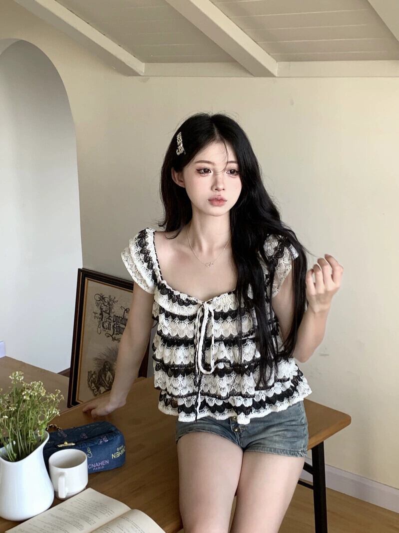 甘くてスパイシーなスクエアネックコントラストカラーノースリーブレースシャツ女性の夏 2023 レースショートシックなシャツ 大人ガーリー スウィート キュート カジュアル サマー 夏物 スクウェア missk23030848665