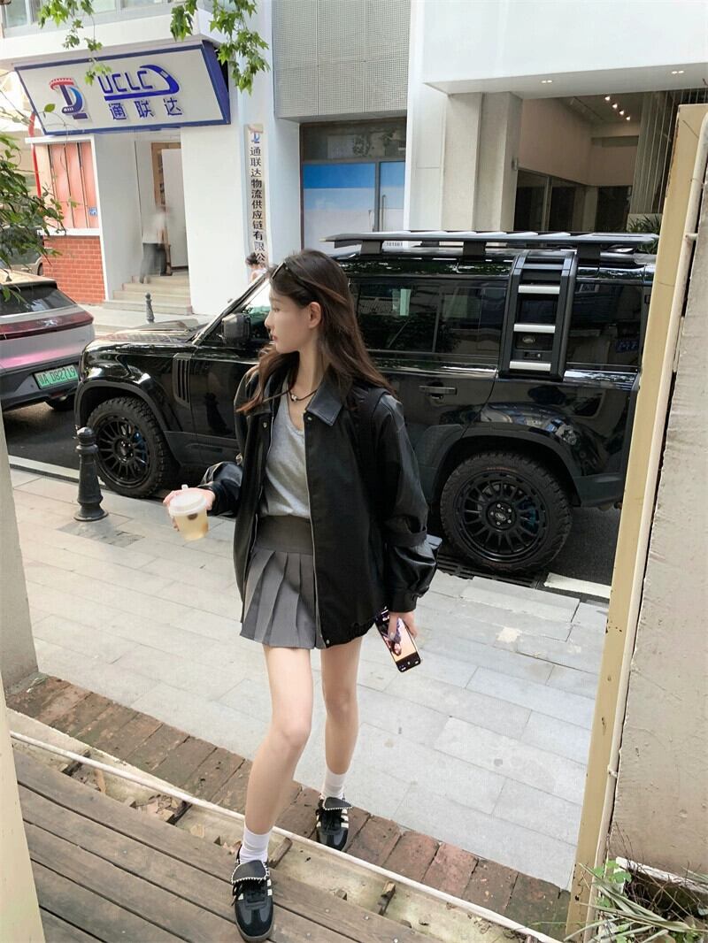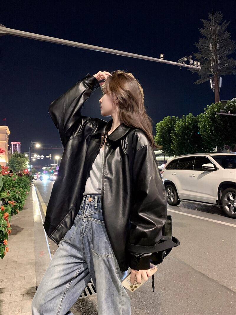 黒革のジャケットの女性の秋バージョン 2023 新しいクールな塩バイクジャケットルーズラペル長袖ジャケットトレンディな ロング ブラック オータム 秋物 レザー missk4171243561