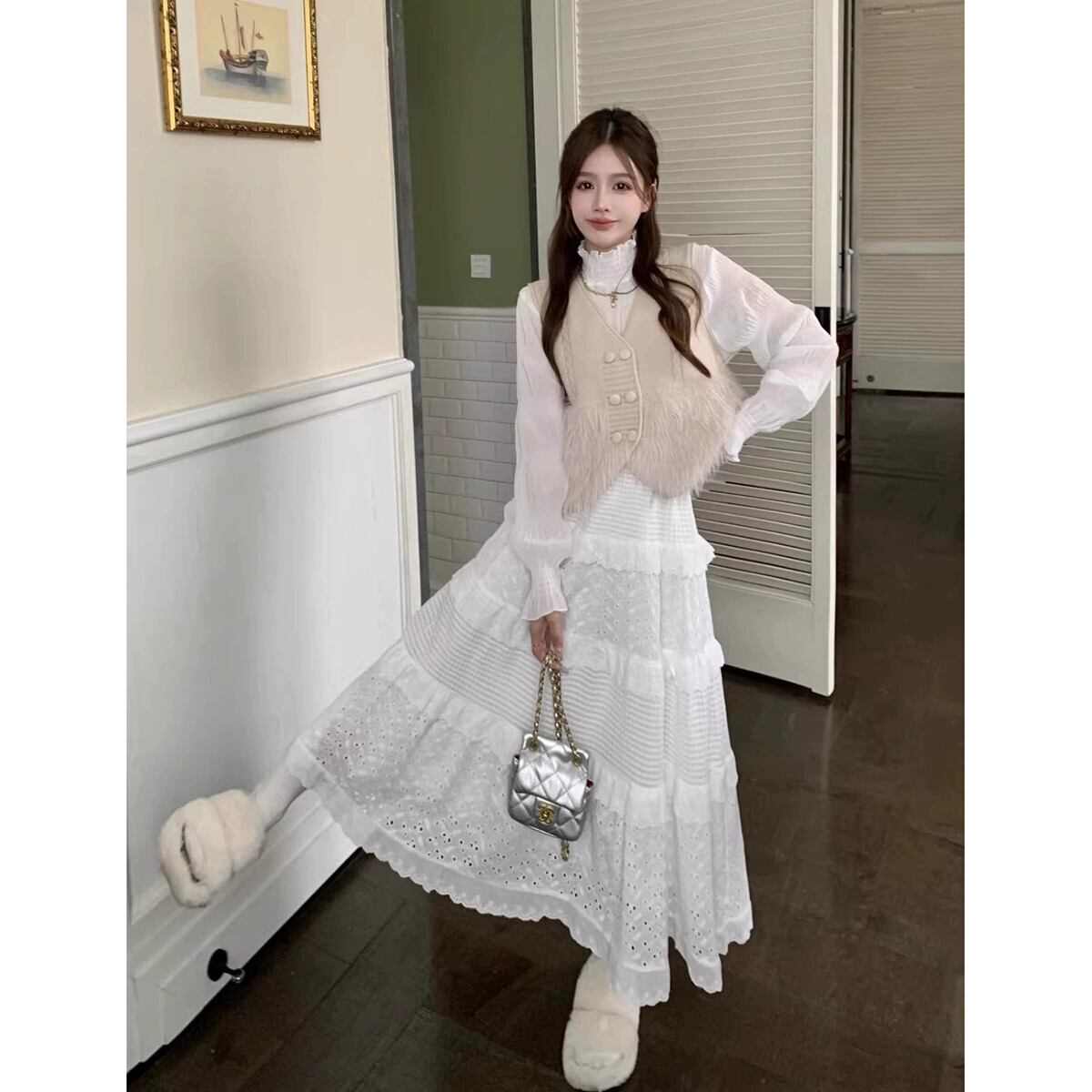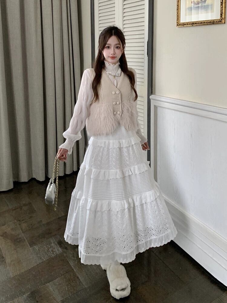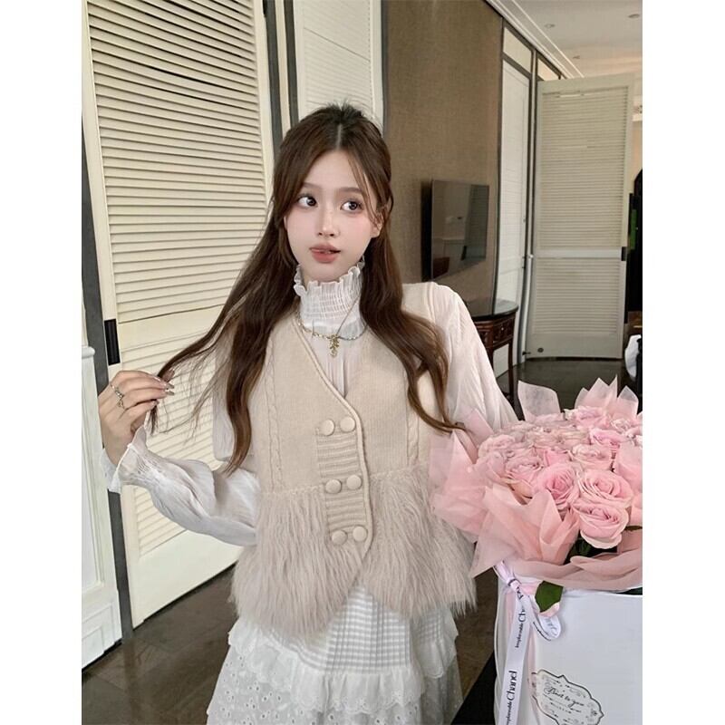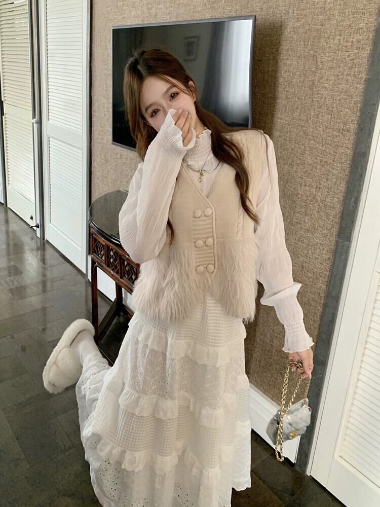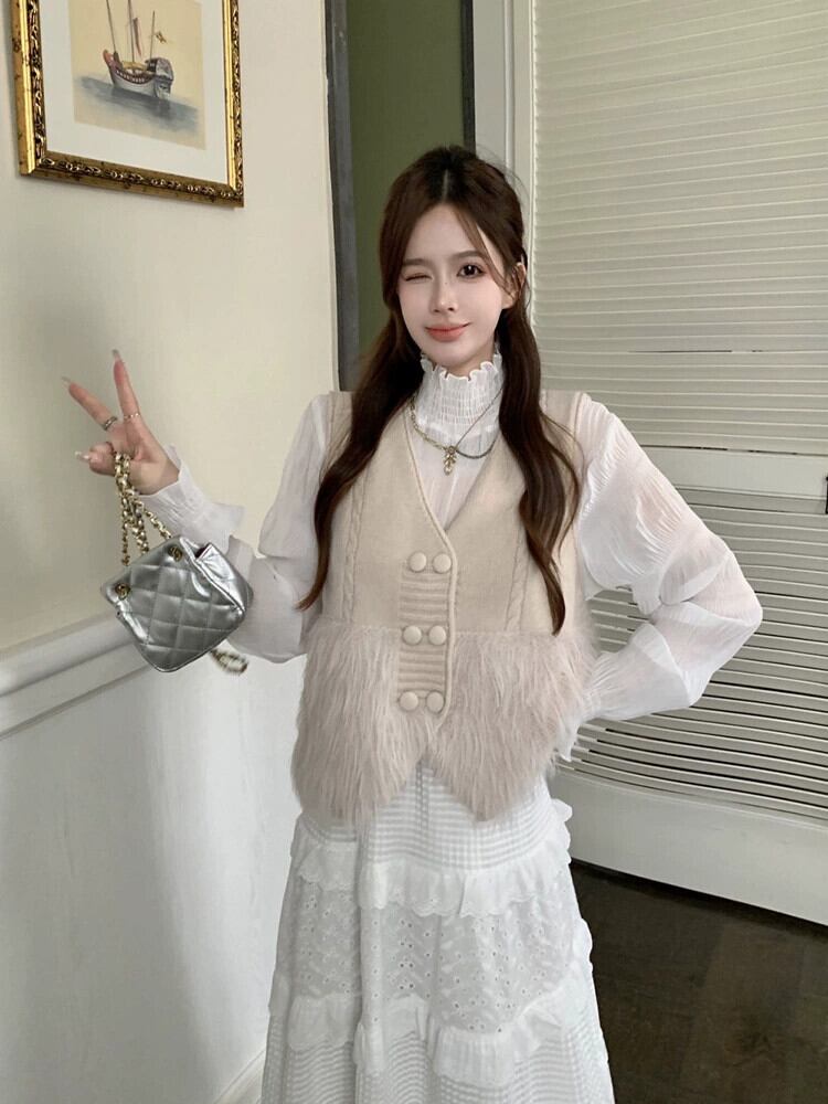 色:アプリコットの毛皮のベスト,ホワイトボトミングシャツ,白いスカート