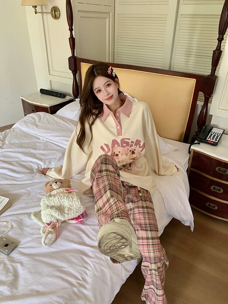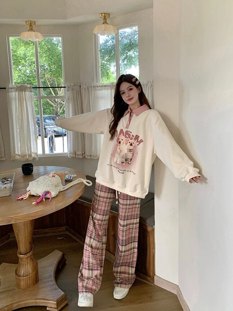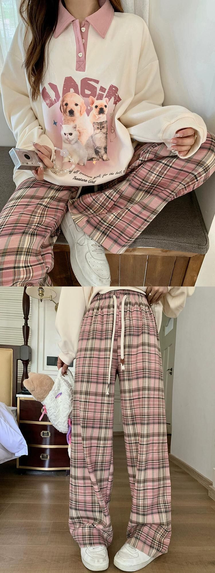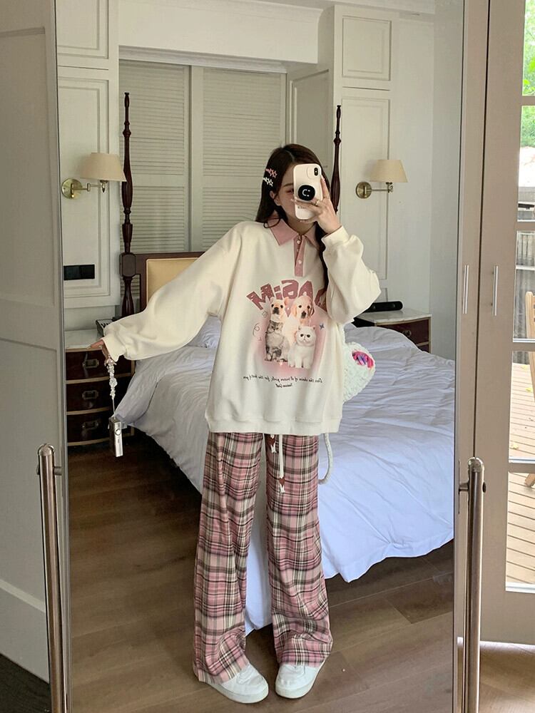 色:ポロカラースウェットシャツ,ピンクのチェック柄ワイドパンツ