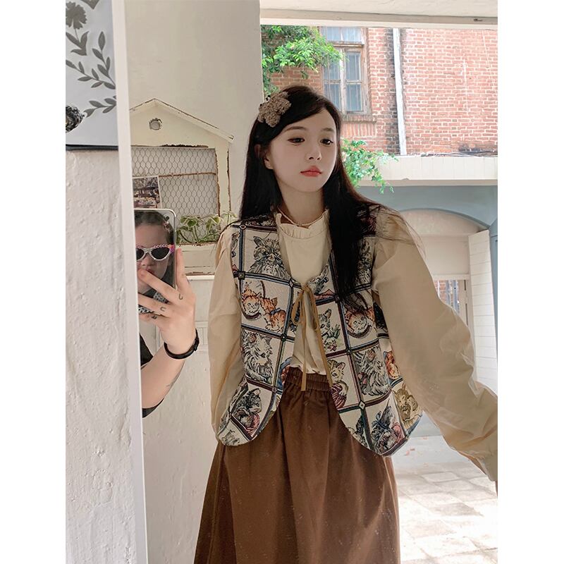 レトロ猫ジャカードデザインレースアップベスト層状長袖シャツ女性秋 2023 新しいファッションスーツ ロング レッド オータム 秋物 missk85762043810