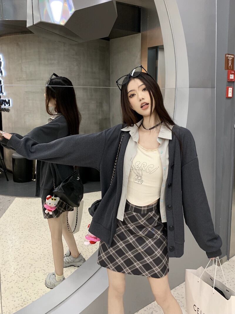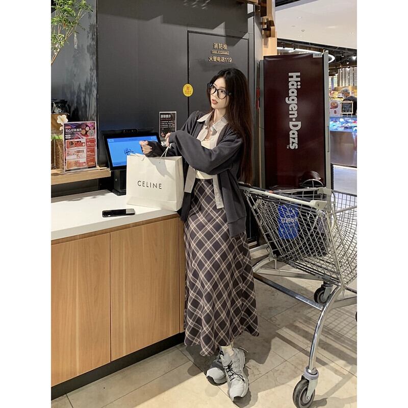 偽ツーピースニットスプライシング長袖ジャケットレトロチェック柄ミッドレングススカート女性秋 2023 新しいスーツ ロング オータム 秋物 missk35170527729