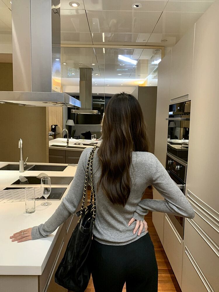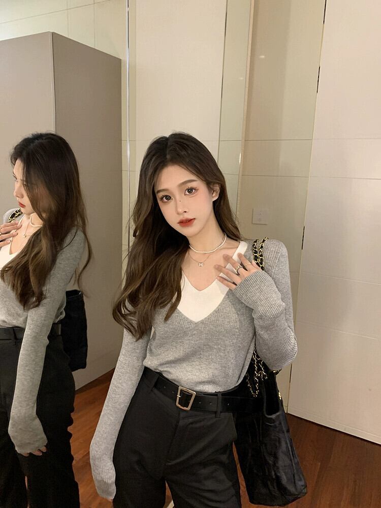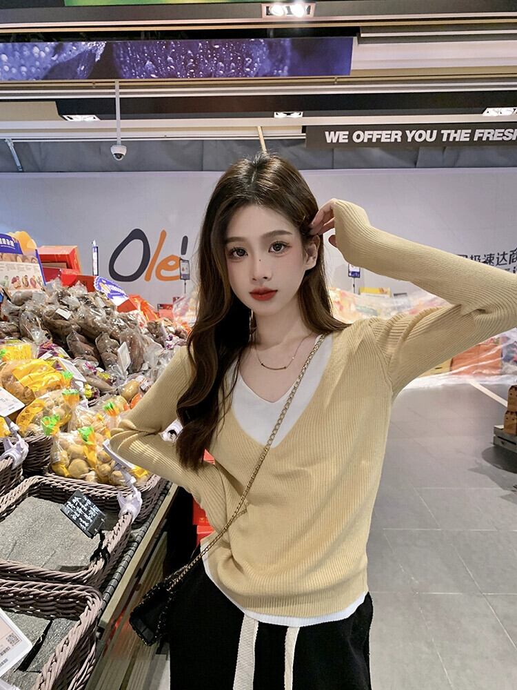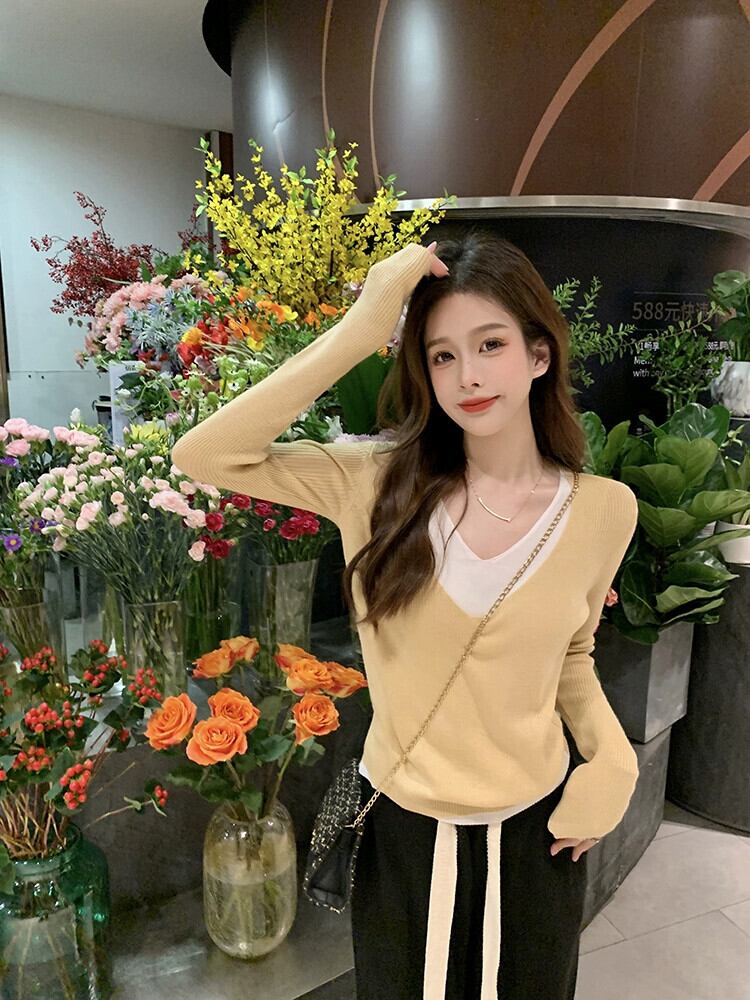優しい風コントラストカラースプライシング長袖セーター女性の 2023 秋の新しいスリムフィット V ネックボトリングトップ ロング オータム 秋物 Vネック missk7136847886