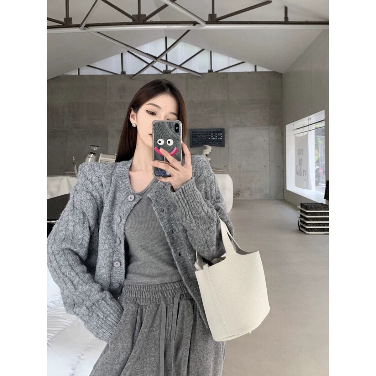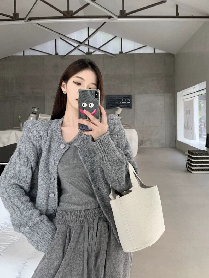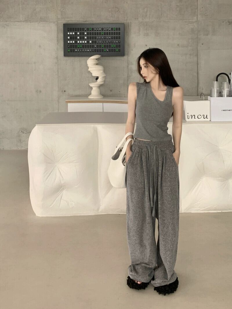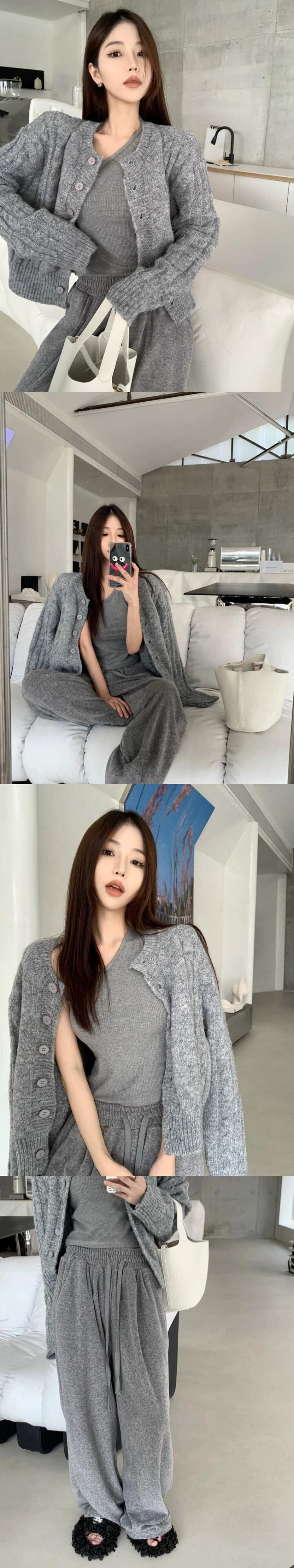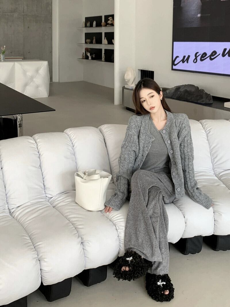 色:カーディガンセーター,不規則なベスト,ワイドレッグパンツ