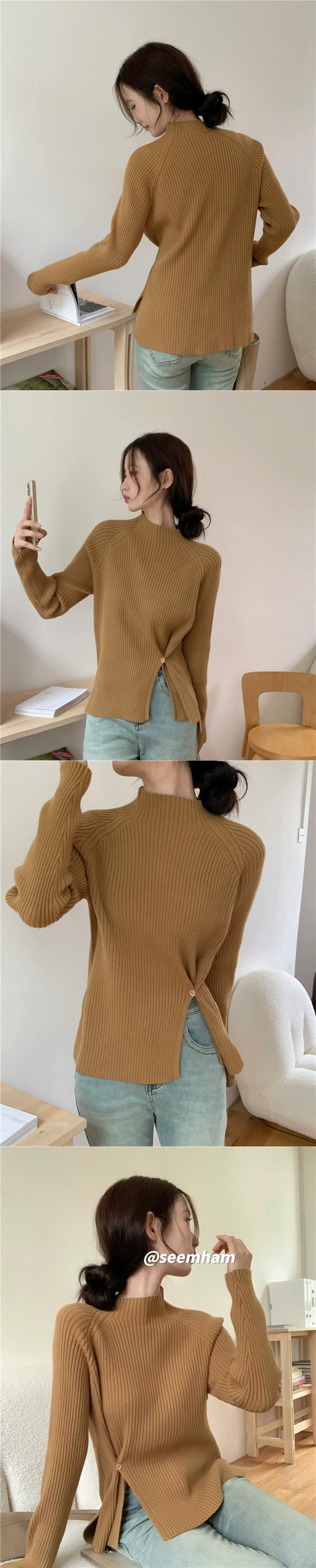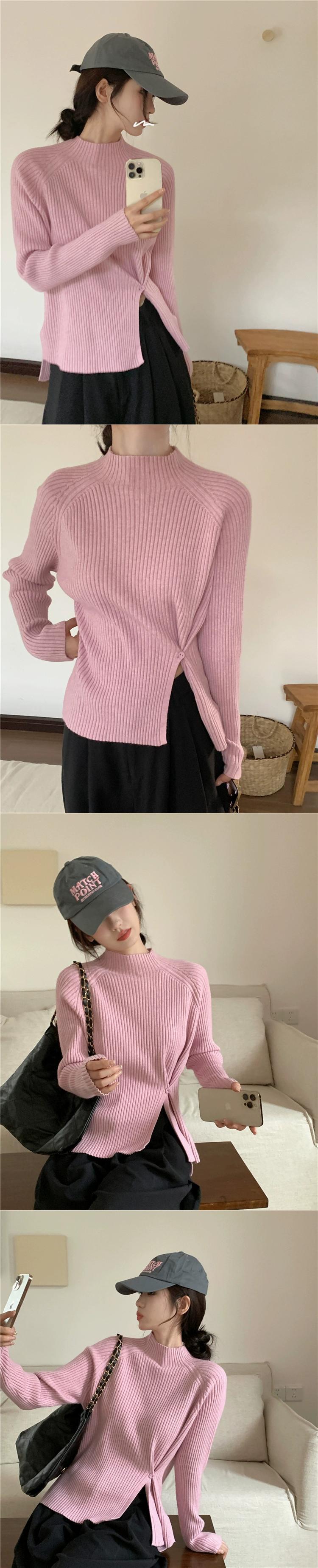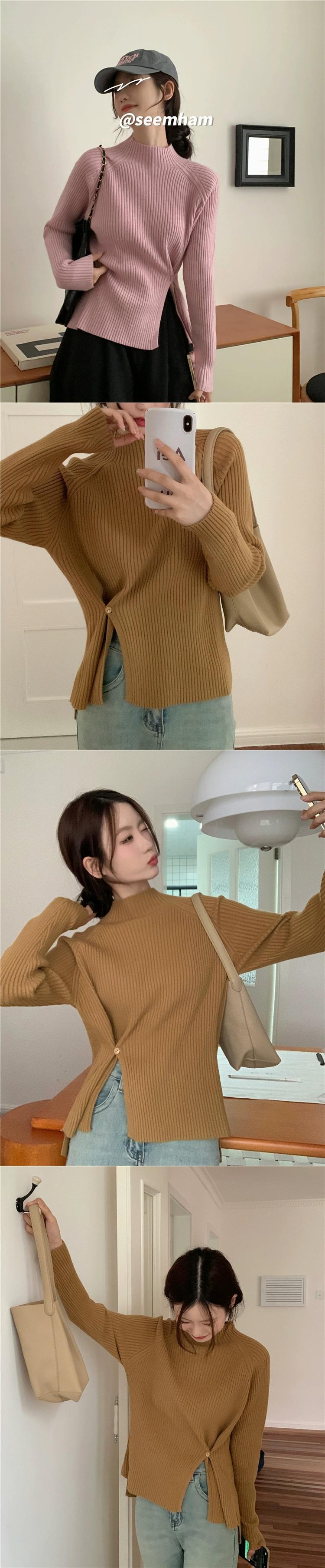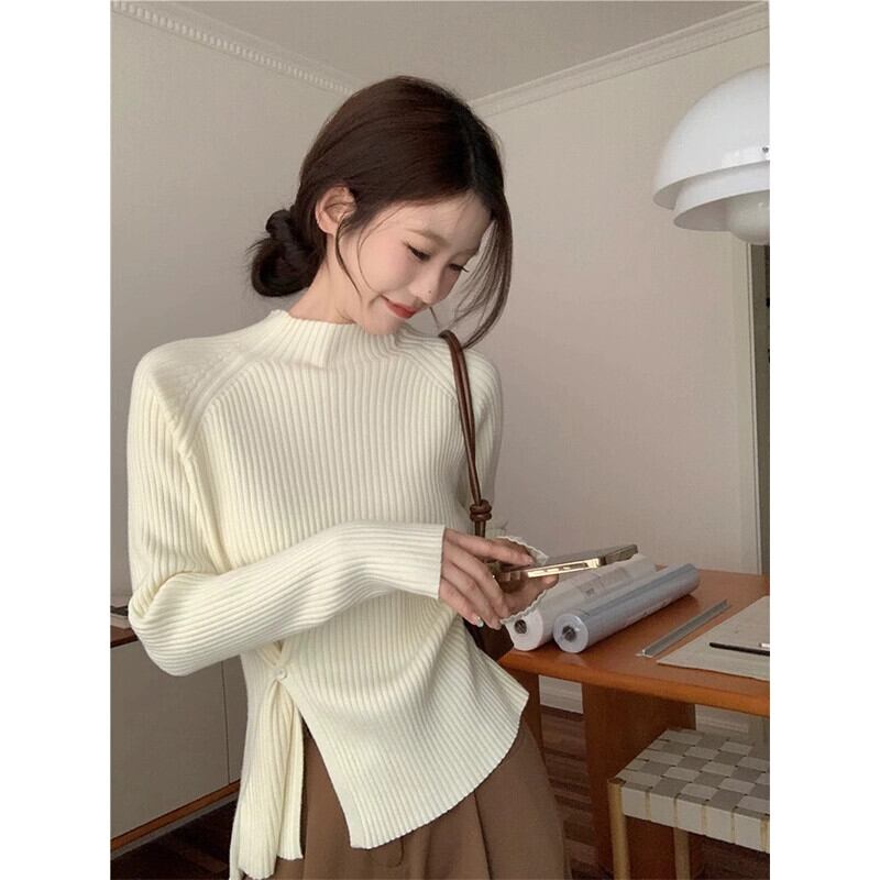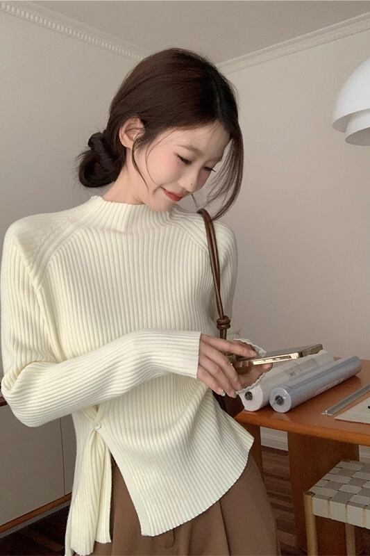 ハーフタートルネック無地スリット長袖セーター女性秋バージョン 2023 新デザインファッションスリムトップ ロング オータム 秋物 ソリッドカラー missk88774997358