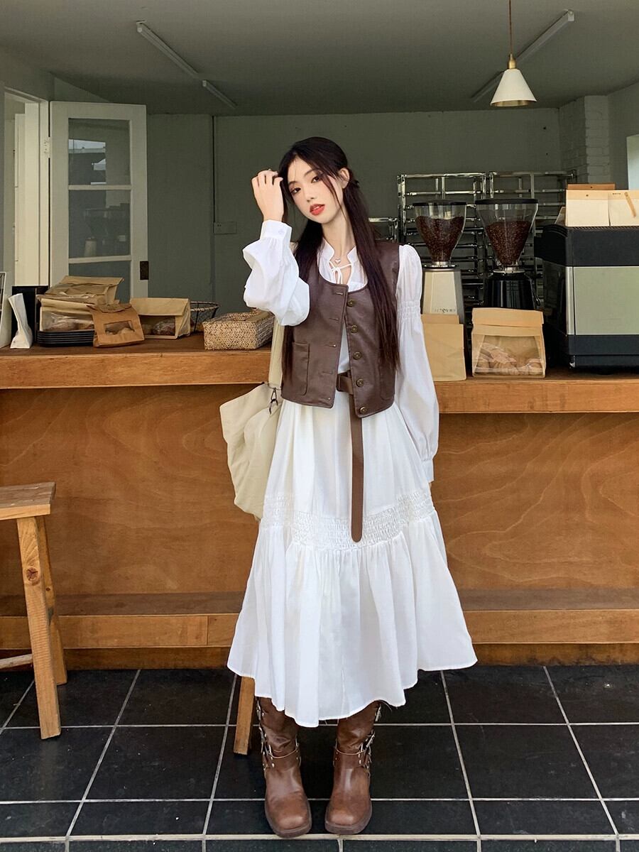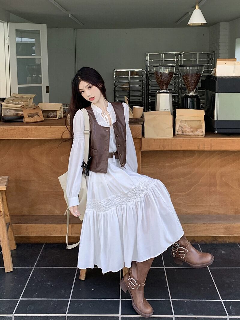 フランスの穏やかなスタイルの白い長袖のドレス女性2023年初めの新しいVネックレースアップ気質ウエストミッドレングススカート ロング ホワイト オータム 秋物 missk40724790219
