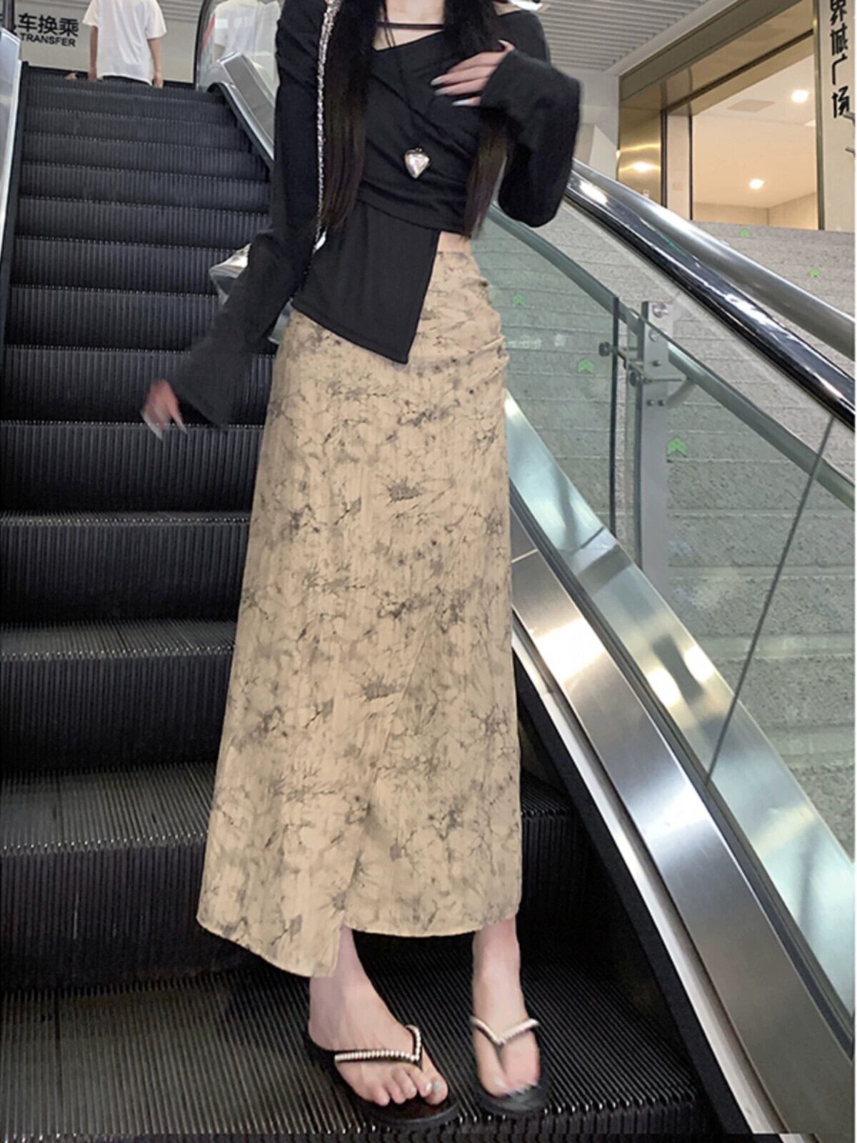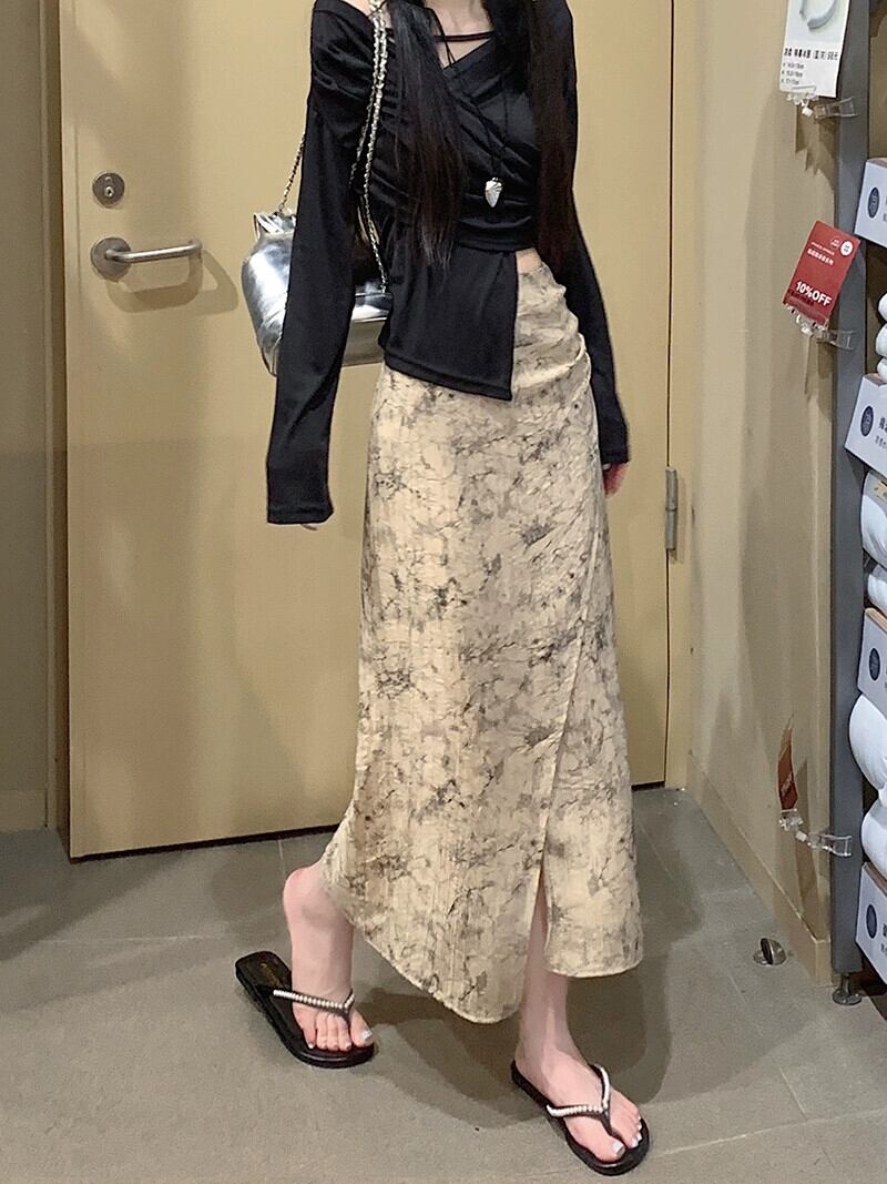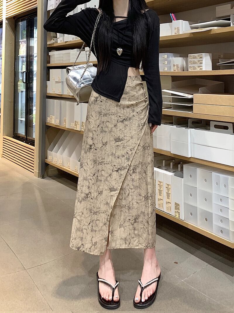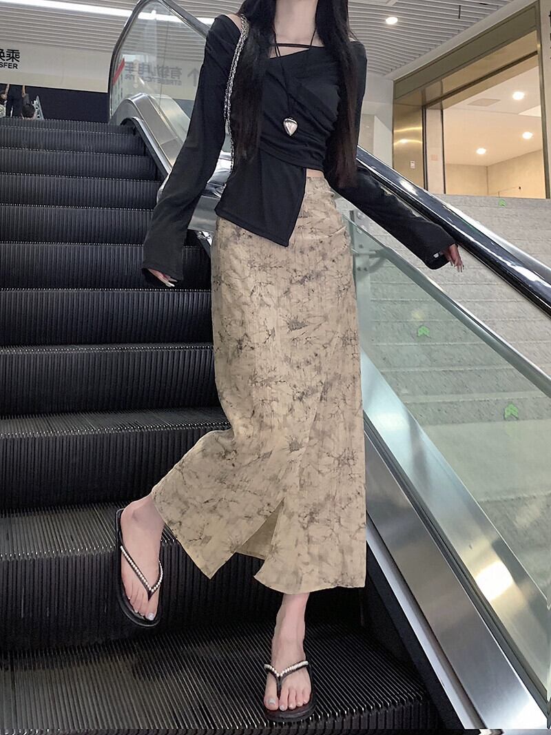 シックなプリントスリットスカート夏の新しいレトロなデザイン気質多用途ハイウエスト A ラインミドル丈スカート女性 ハイウェスト サマー 夏物 Aライン missk10726735387