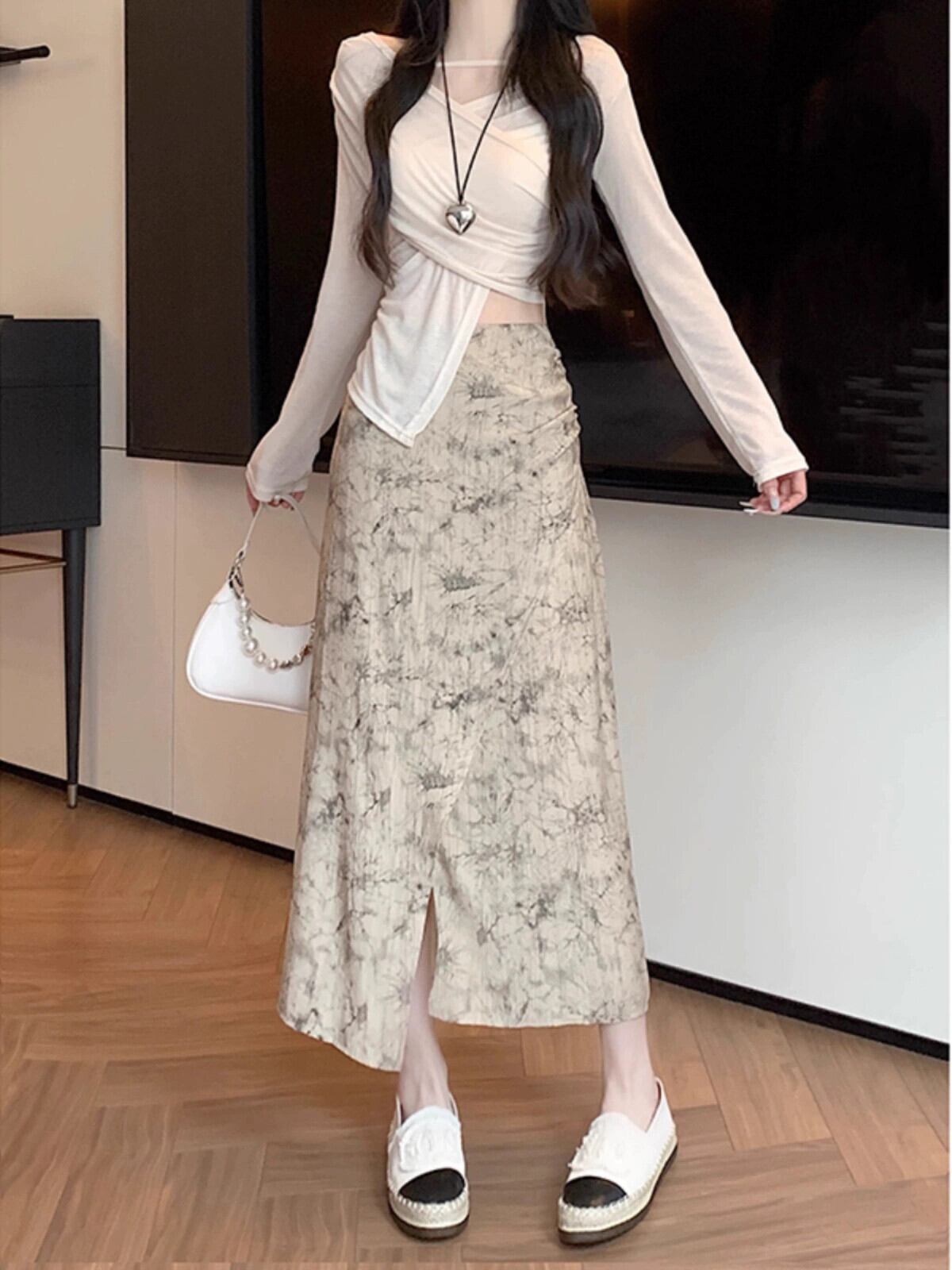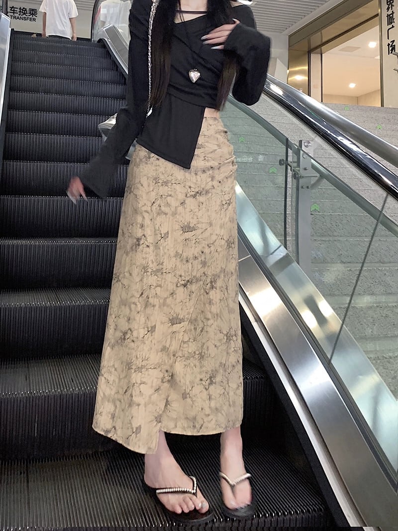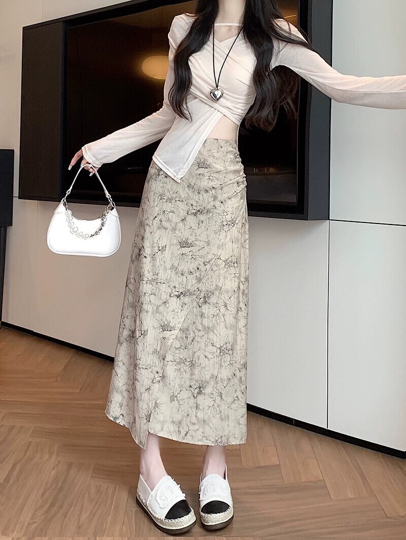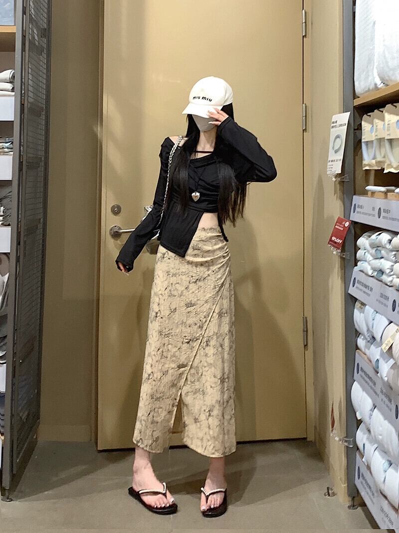 シックなプリントスリットスカート夏の新しいレトロなデザイン気質多用途ハイウエスト A ラインミドル丈スカート女性 ハイウェスト サマー 夏物 Aライン missk10726735387