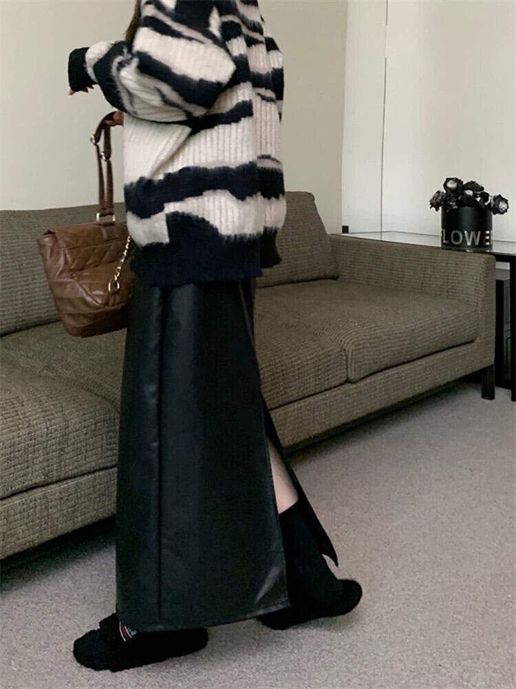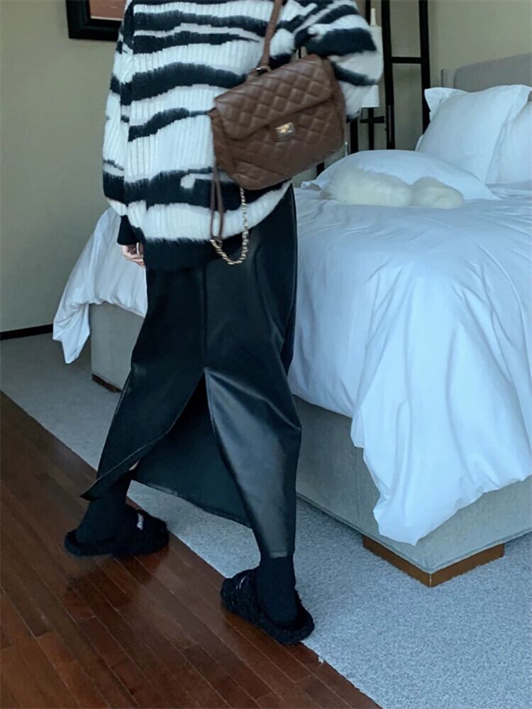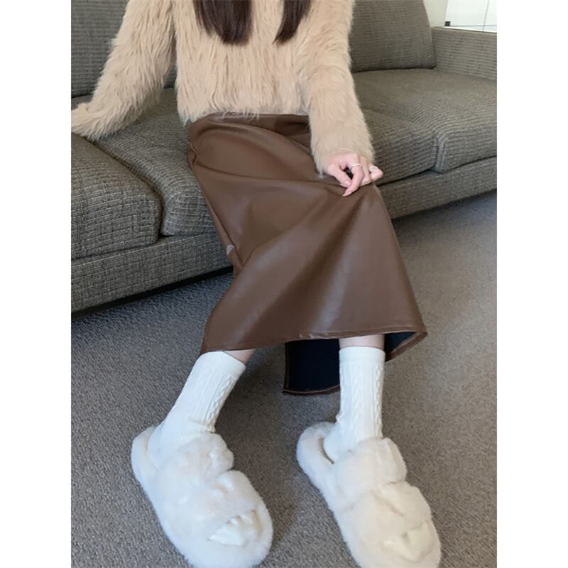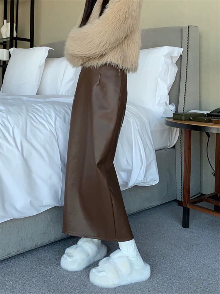 コーヒー色の PU レザースカートの女性秋の新レトロハイウエストスリムファッションデザインスリットロングレザースカート ハイウェスト オータム 秋物 missk20752988102