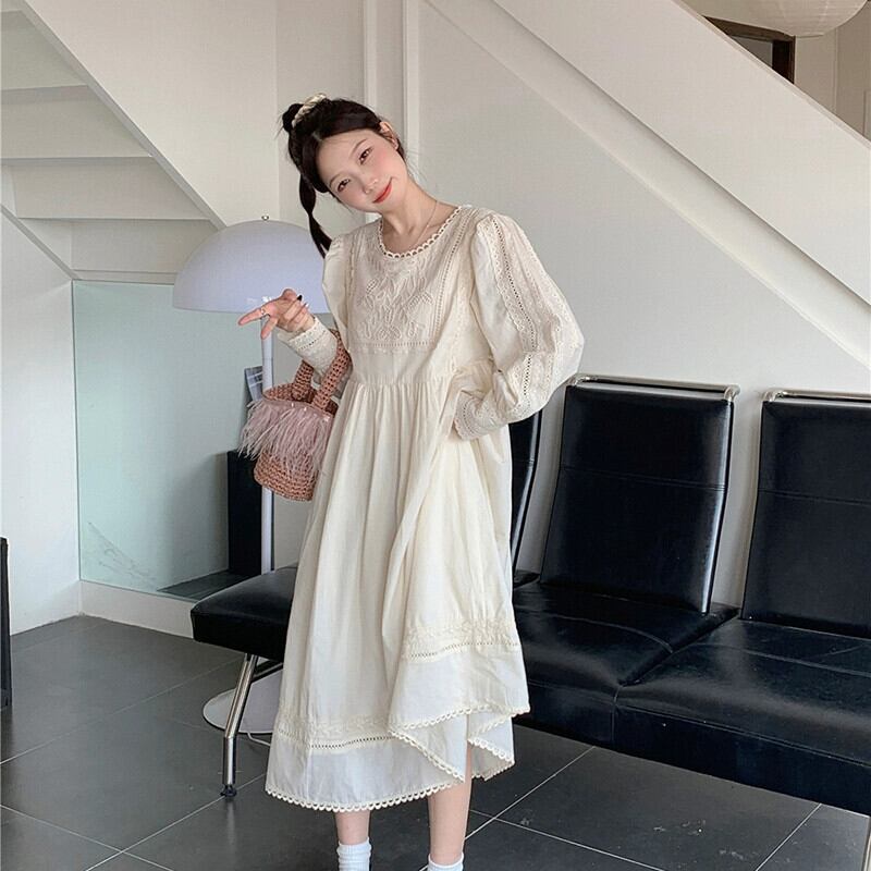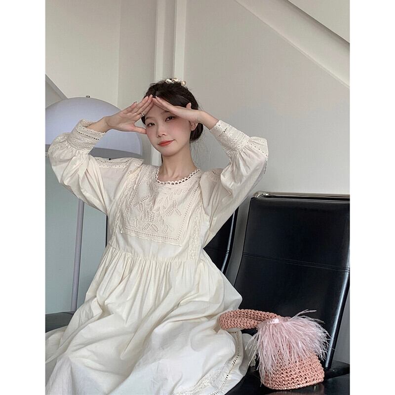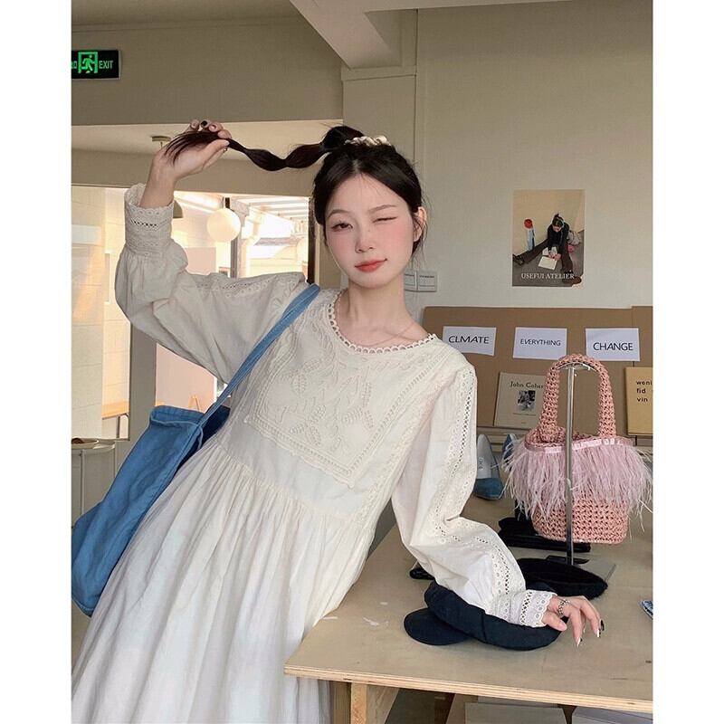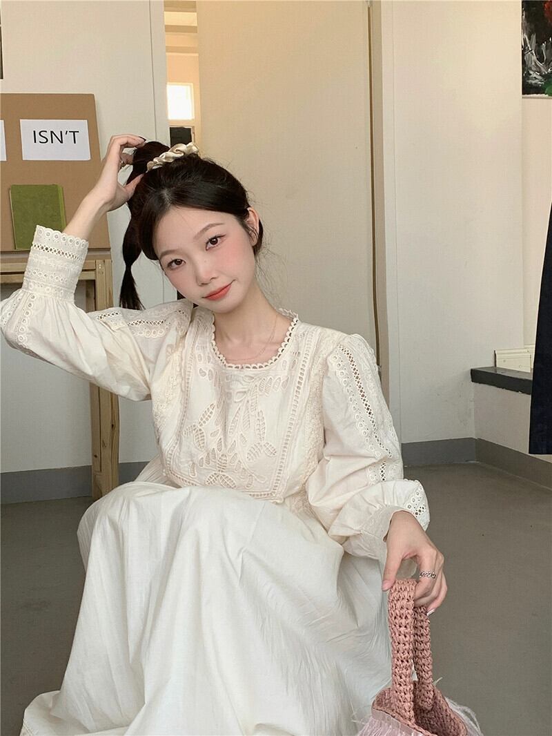 フレンチドレスの女性の夏 2023 新しいレトロ文学中空フックフラワーミッドレングスハイウエスト長袖 A ラインスカート ハイウェスト ロング サマー 夏物 Aライン フラワーデザイン missk77093415958